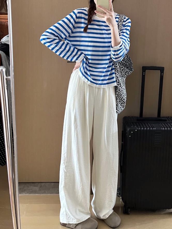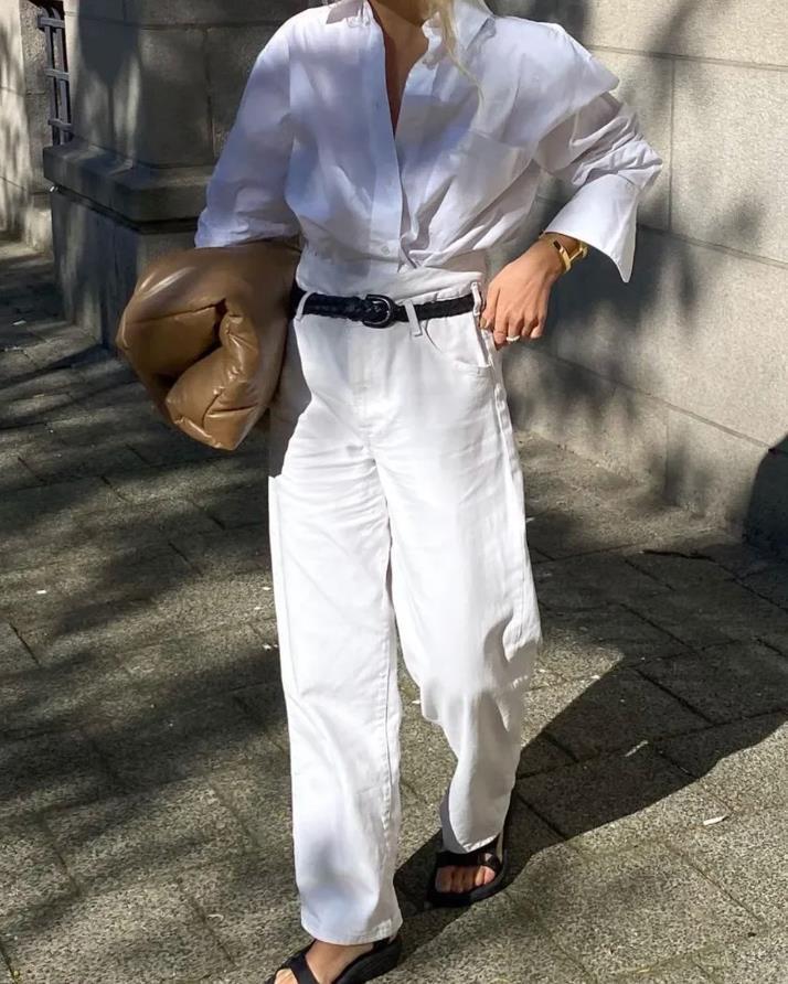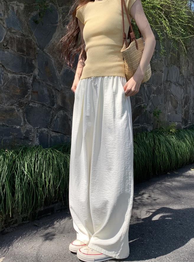 今年夏天一定要爲自己入手一條白褲子啊,寬鬆的闊腿版型,穿起來實在是太顯瘦和藏肉了,褲子的垂墜感也十分不錯,不經意間就拉長腿部線條。上衣建議選擇修身點的t恤或針織短袖,結合起闊腿褲,對身材進行了很好的修飾和優化。