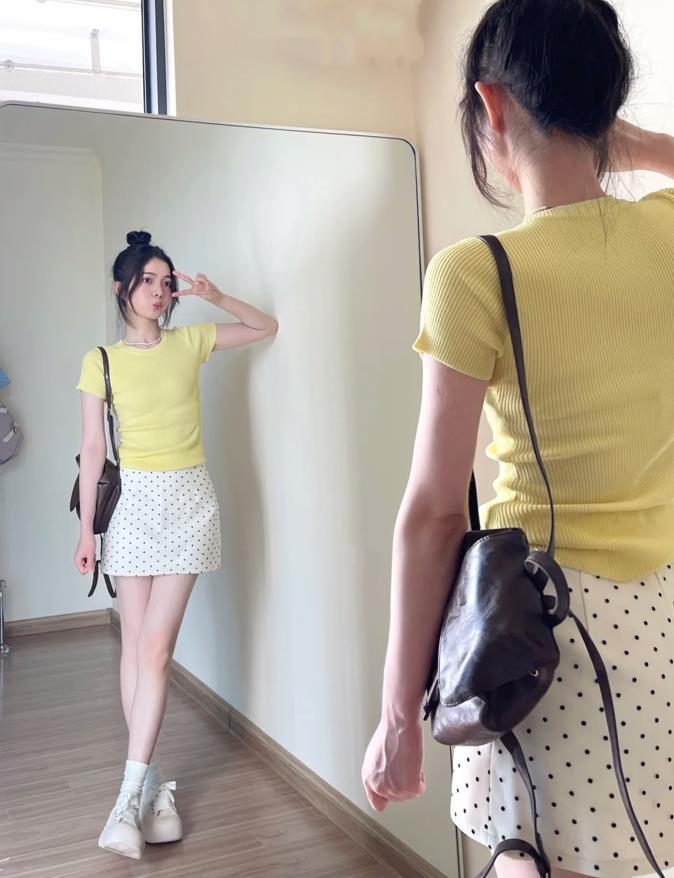頗顯韓系少女風的一套穿搭,低飽和度的黃色針織短袖,這個色調,穿上不僅襯膚色,還十分顯白,就算你是黃黑皮都可以駕馭的。薄款的針織,很透氣舒適,與白色小短裙相配,滿滿的青春活力,少女範十足。