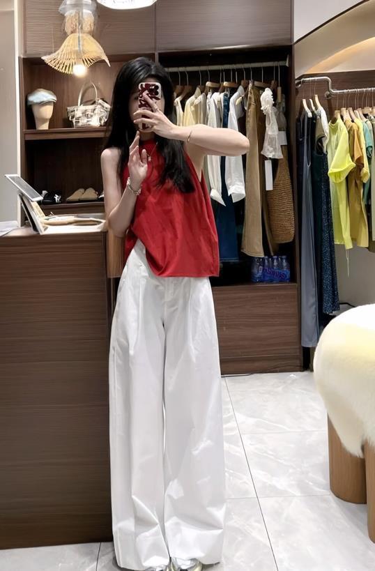 紅色+白色的配色,既吸睛又不會過分高調,紅色無袖上衣+白色休閒闊腿褲,上衣是復古紅色,簡約又大方,寬鬆的褲子,任何一種腿型都可以駕馭,巧妙遮掩起腿粗的缺點,一整套看起來是那麼慵懶隨性又舒服。