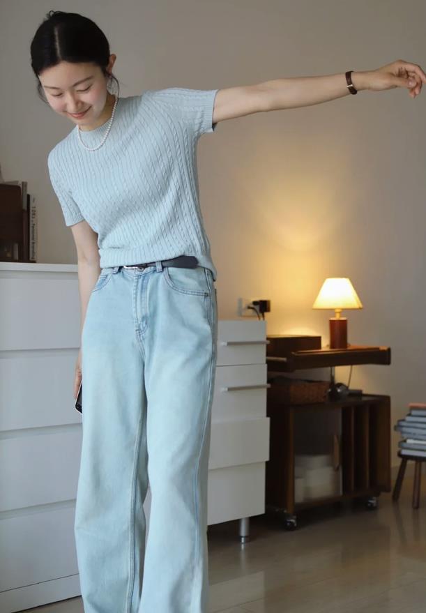在夏天裏的穿搭,就是喜歡穿得清爽一些,薄荷藍色調,也太襯膚色了吧,很顯白,薄款針織短袖,貼身穿也很柔軟舒適,選擇一條牛仔藍直筒長褲,不僅顯瘦藏肉,還可以把雙腿襯托得筆直和修長。