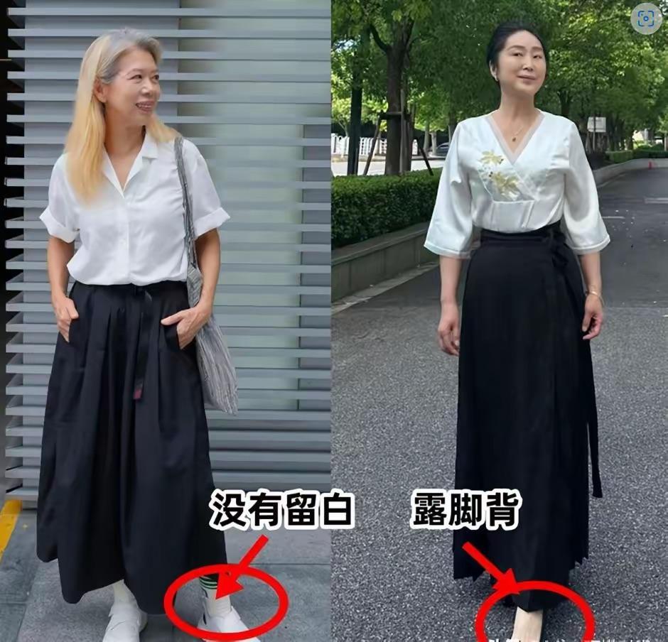 如果要更加清爽顯高的穿搭,我們穿白襯衫+黑色過膝半身裙的時候,可以選擇配淺口鞋露出腳背,讓整體穿搭更爲輕盈。