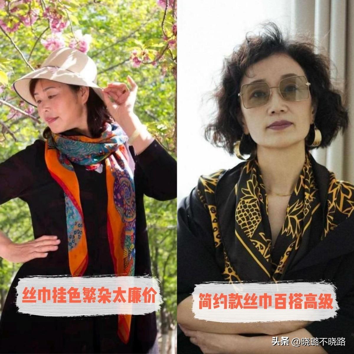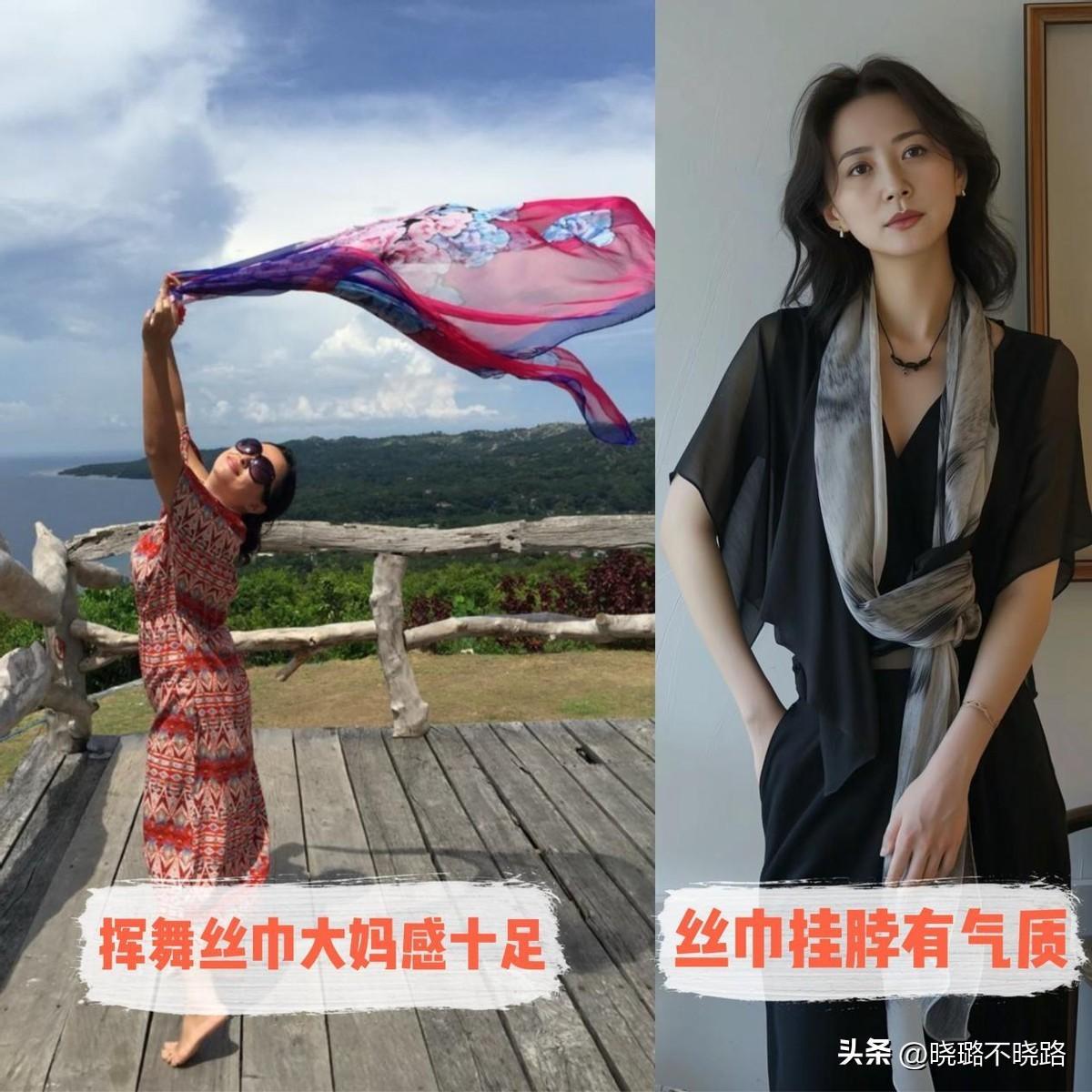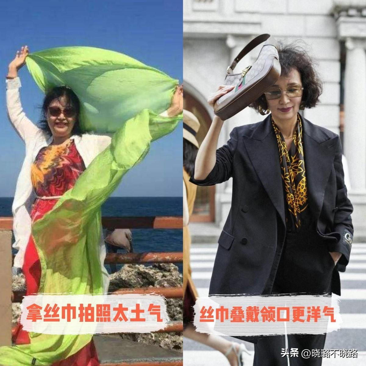 不懂得運用絲巾的大齡女人,總是喜歡將絲巾當成拍照道具,並且挑選的絲巾款式也很廉價,再加上衣服沒穿對,最終的效果自然會顯得很油膩老氣。