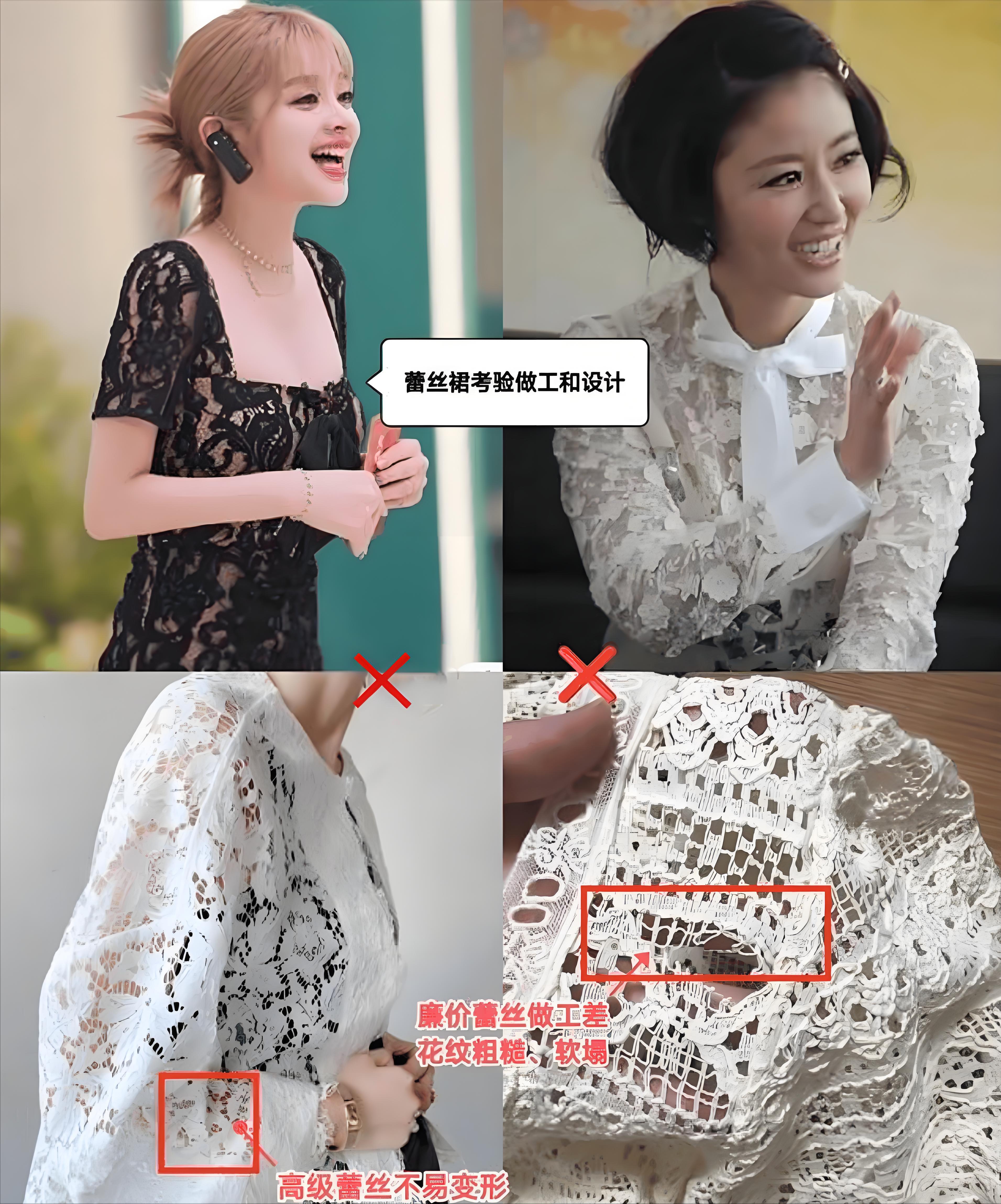容易掛線、比較粗糙的蕾絲,經不起細節的打磨,仔細一看滿是廉價感。如果一定要選擇蕾絲,建議選擇相對寬鬆、質感比較高級的蕾絲衫。
