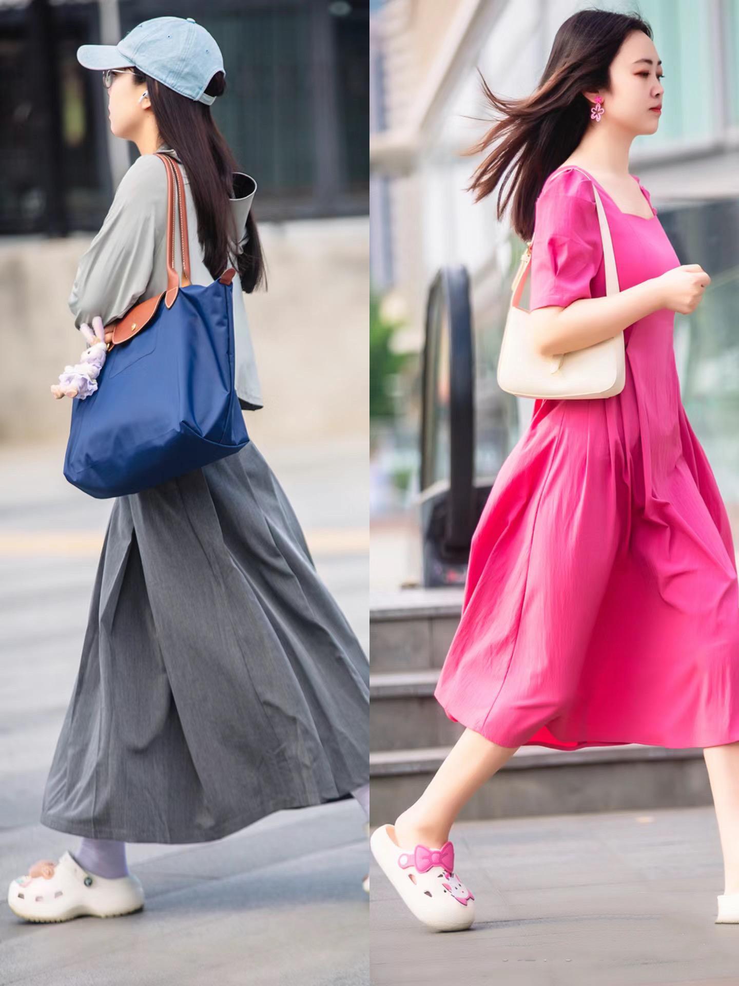 比如一條玫紅色的連衣裙,搭配玫紅色鞋花裝飾的洞洞鞋,瞬間有了一種在逃公主的既視感。這樣搭穿搭,真的是顯白又洋氣。