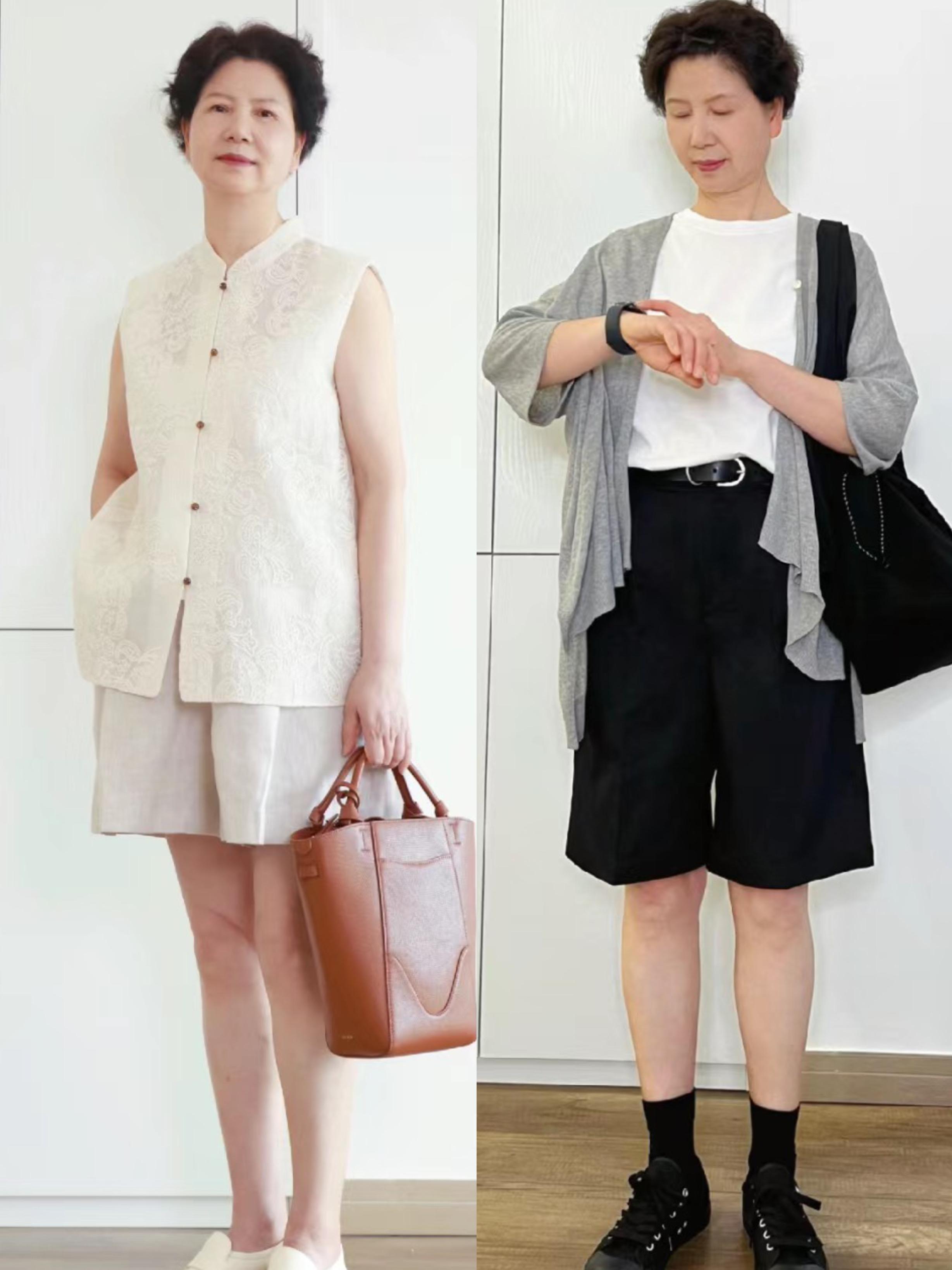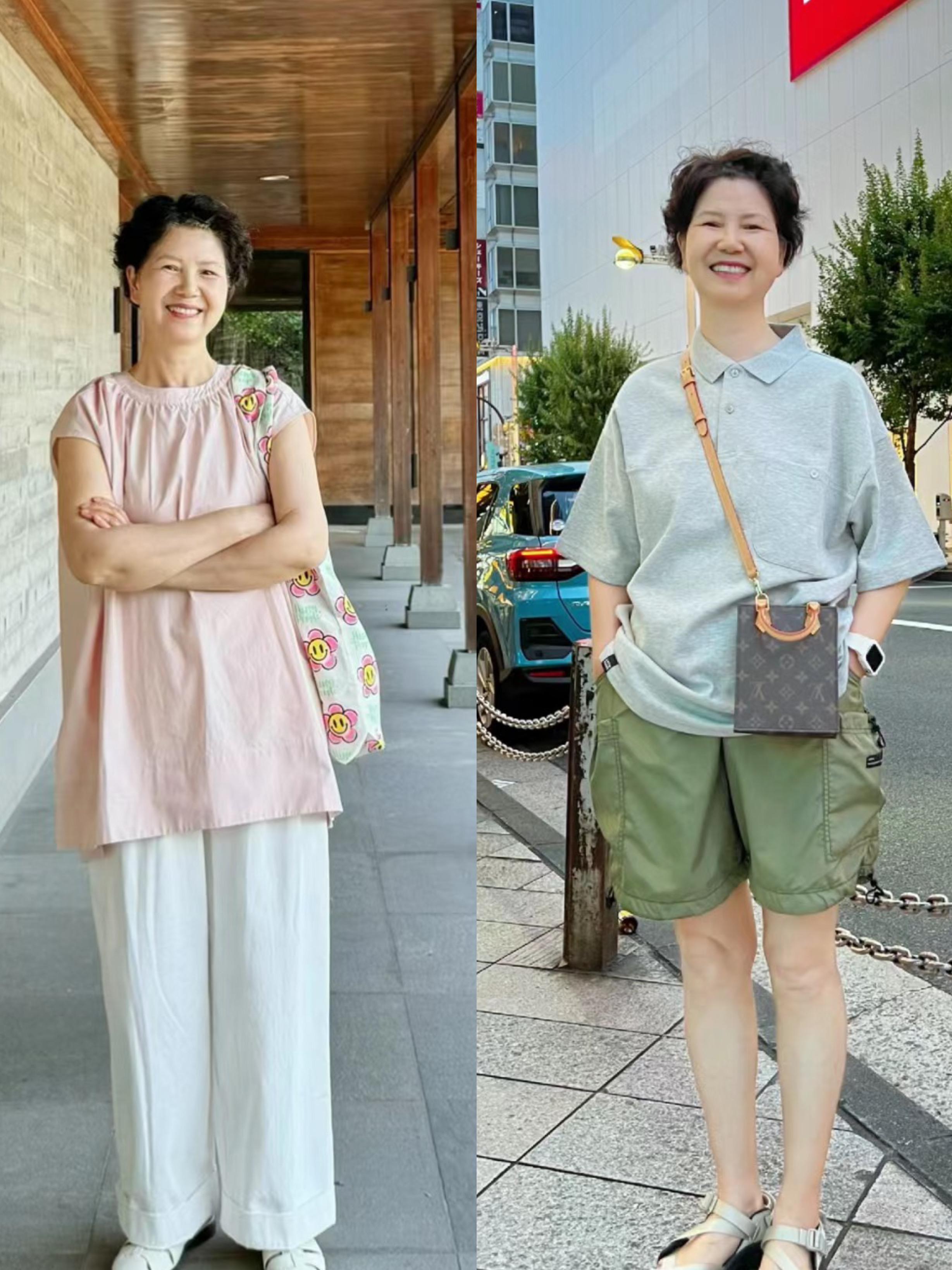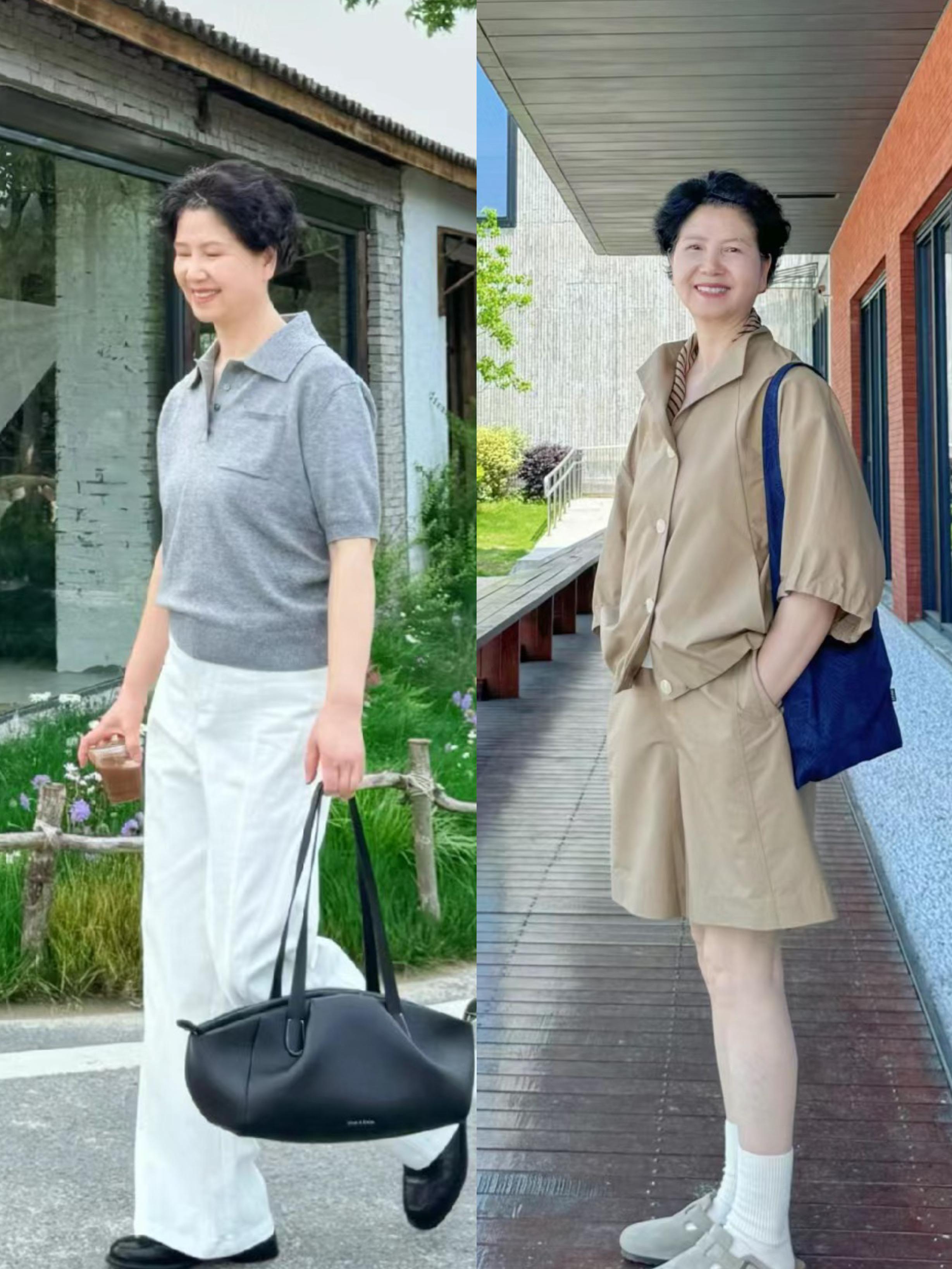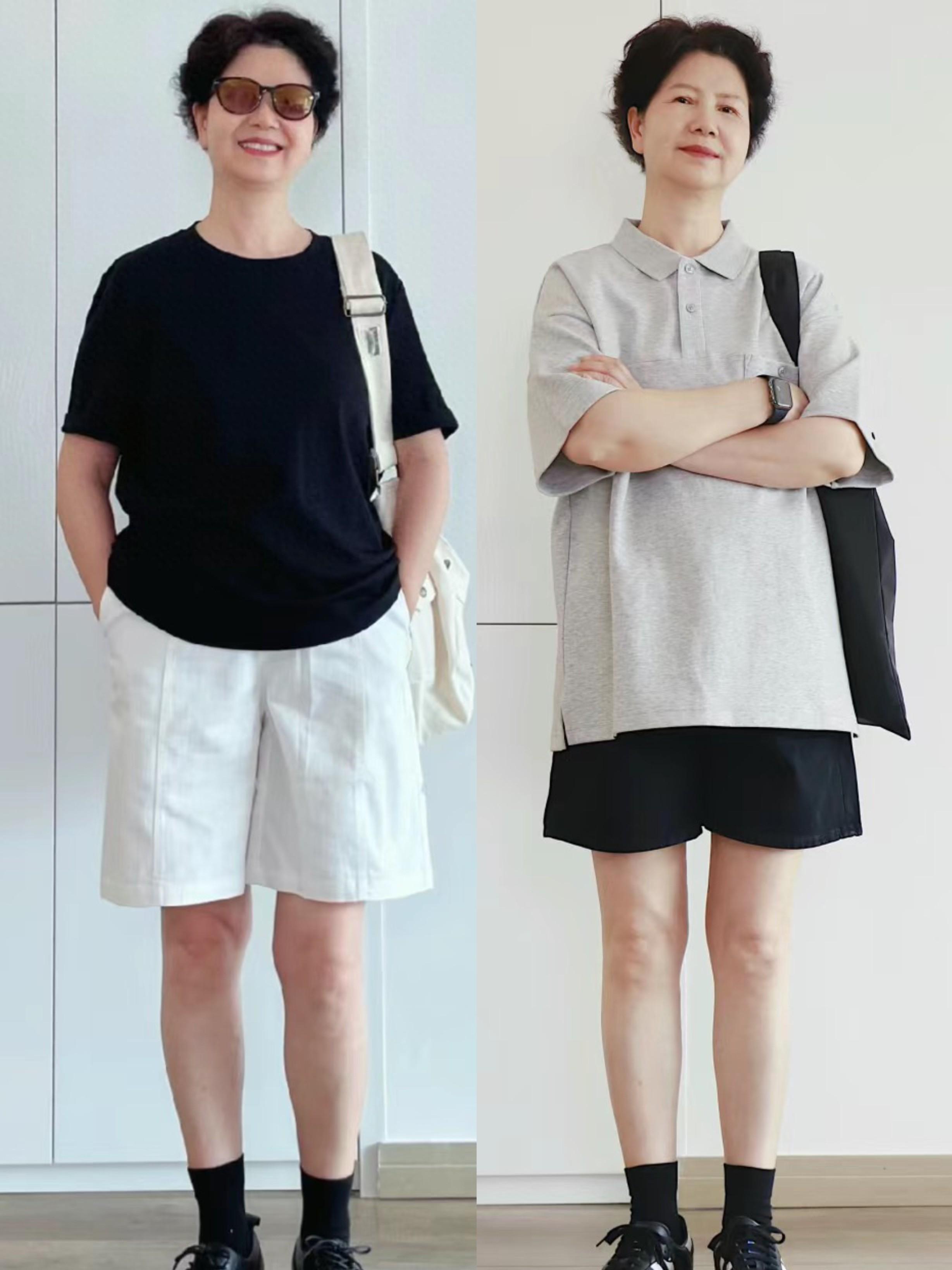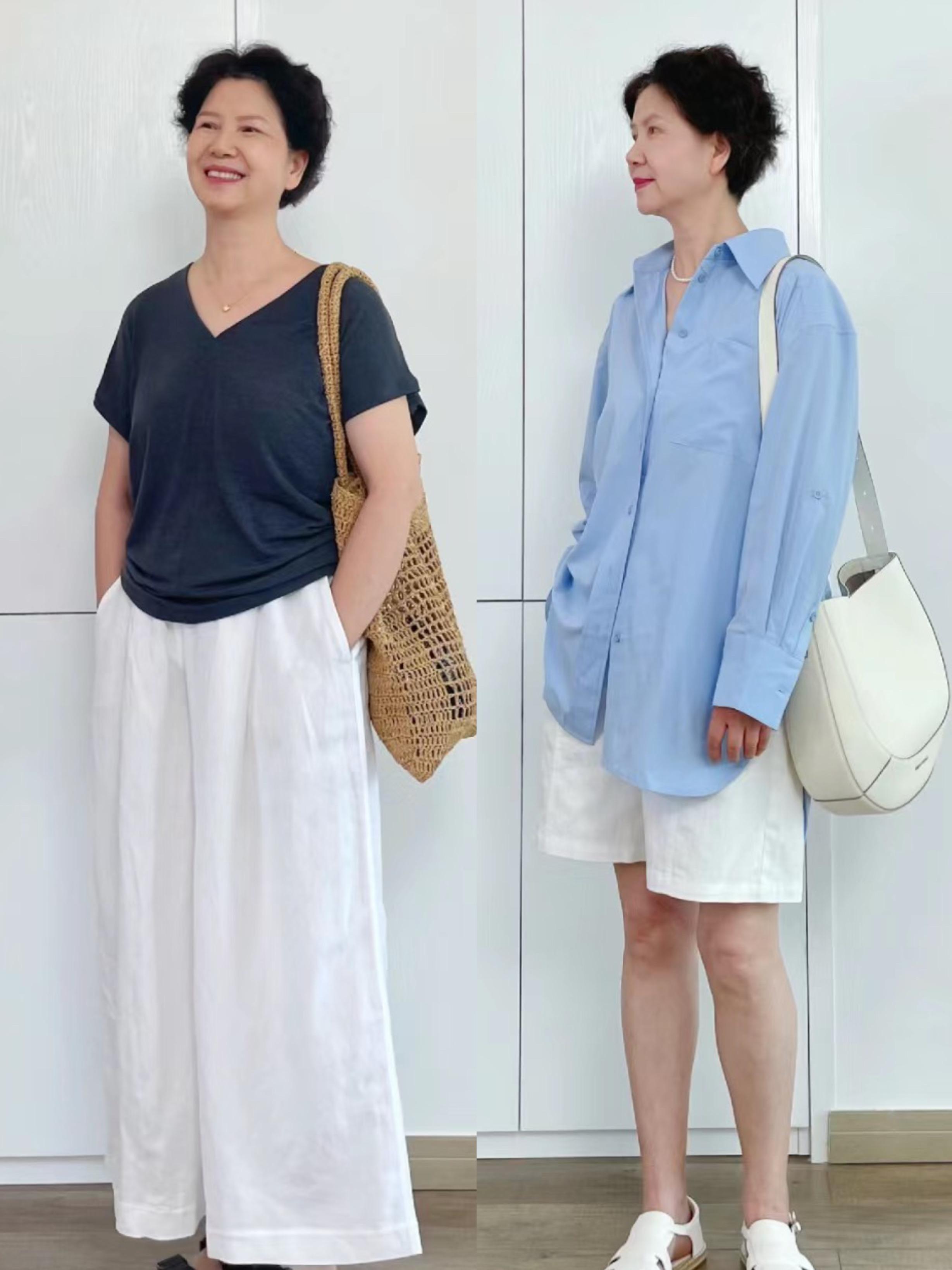 60+的中年女人,想要更顯年輕,一定要多嘗試無齡感單品。比如寬鬆的T恤、襯衫、闊腿褲、A字形短褲等單品。