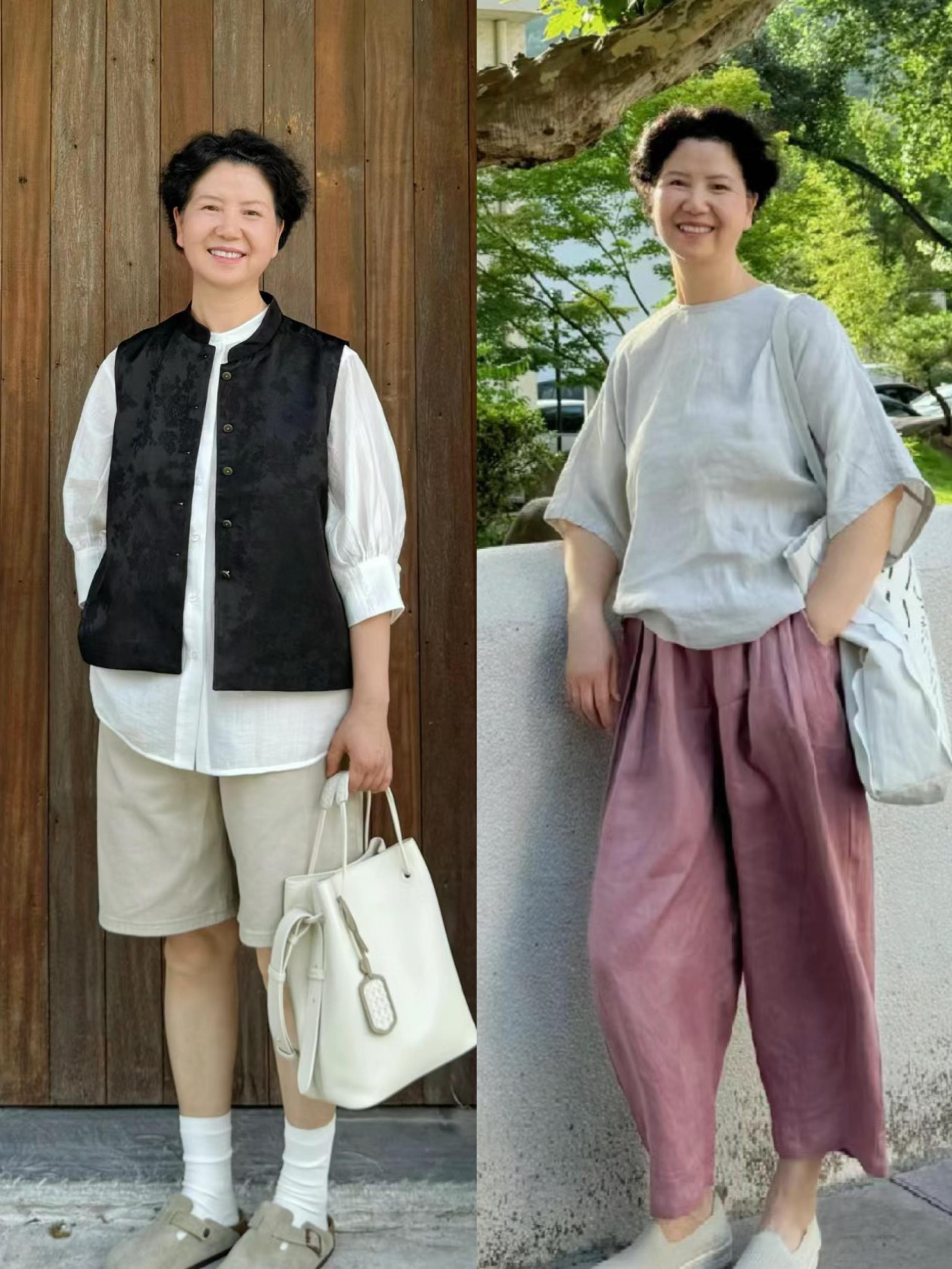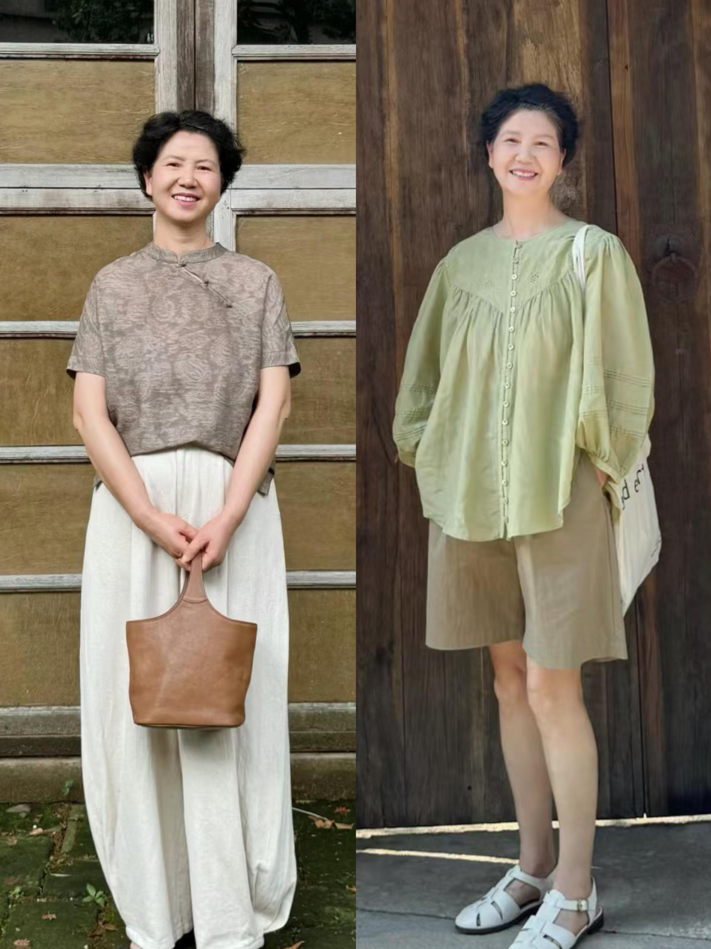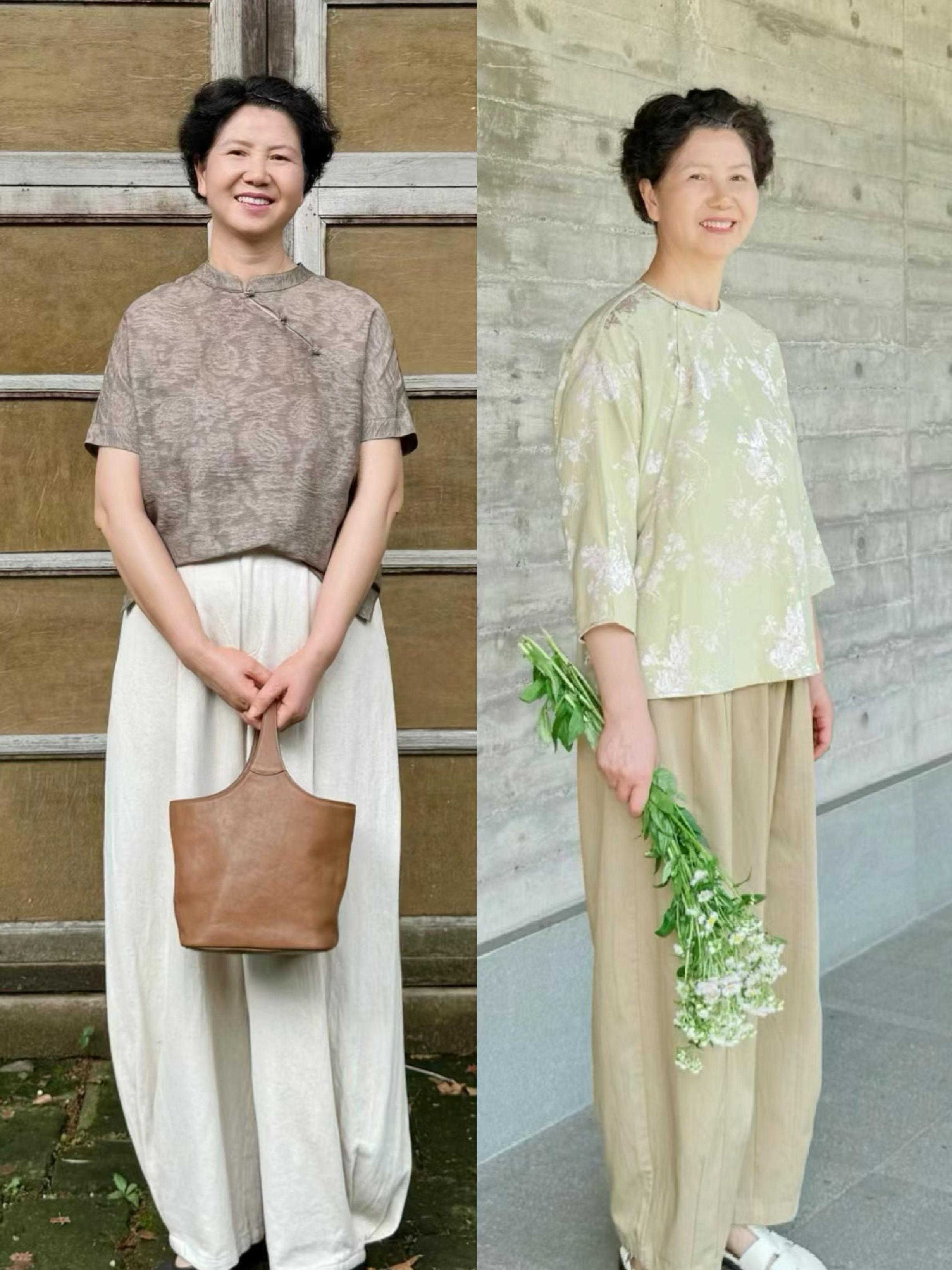 喜歡國風喜歡搭的阿姨,也可以參考小蘇阿姨的打扮。國風元素除了旗袍、長衫,還可以選擇國風的短袖、襯衫,等容易搭配的單品。