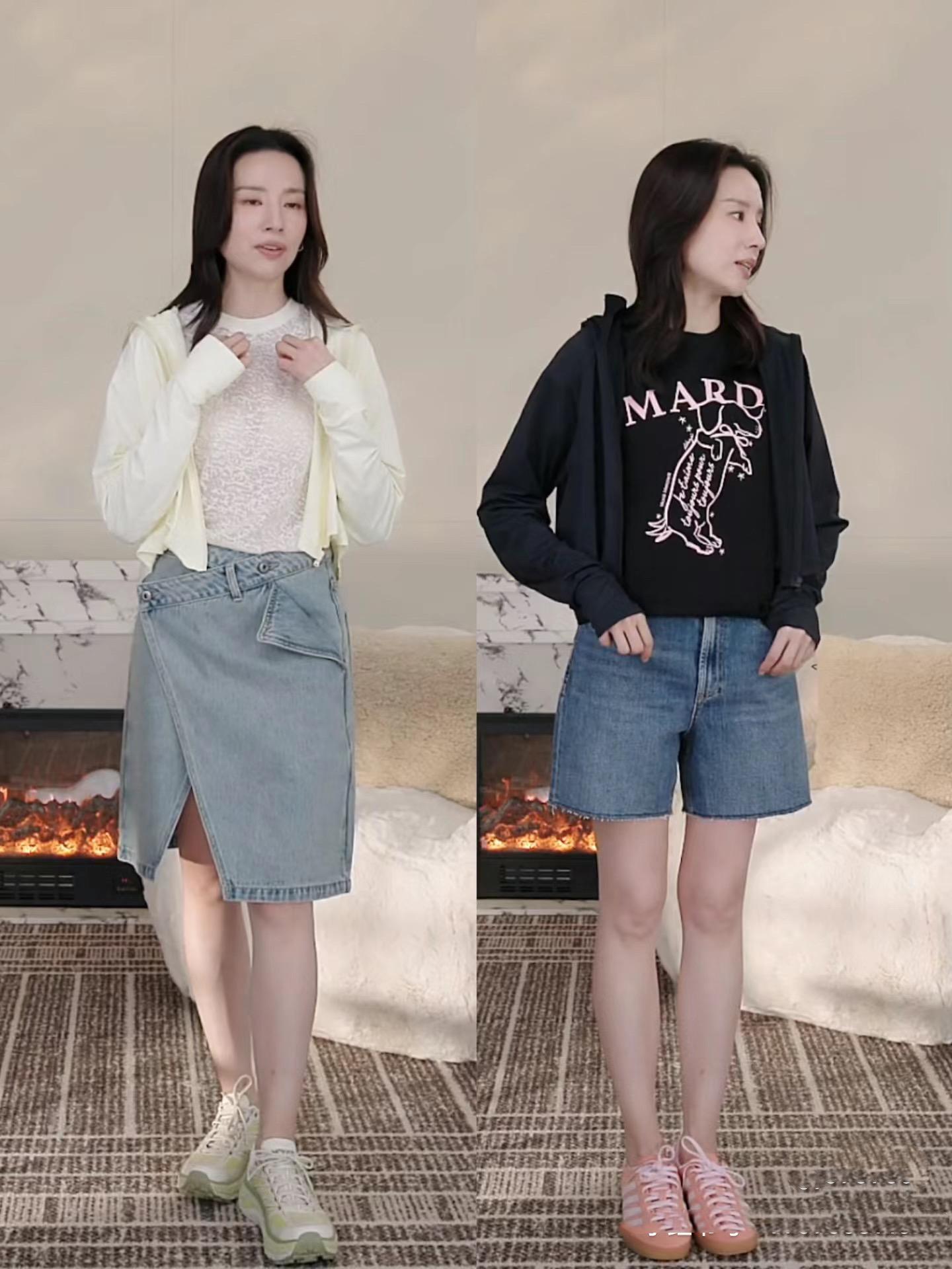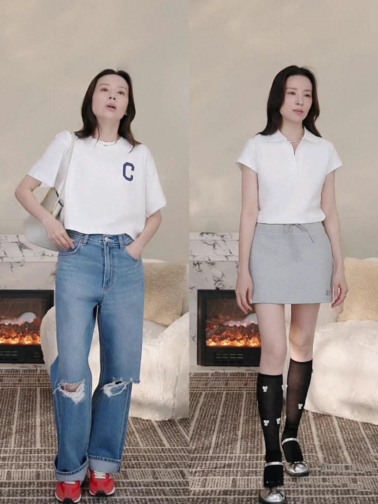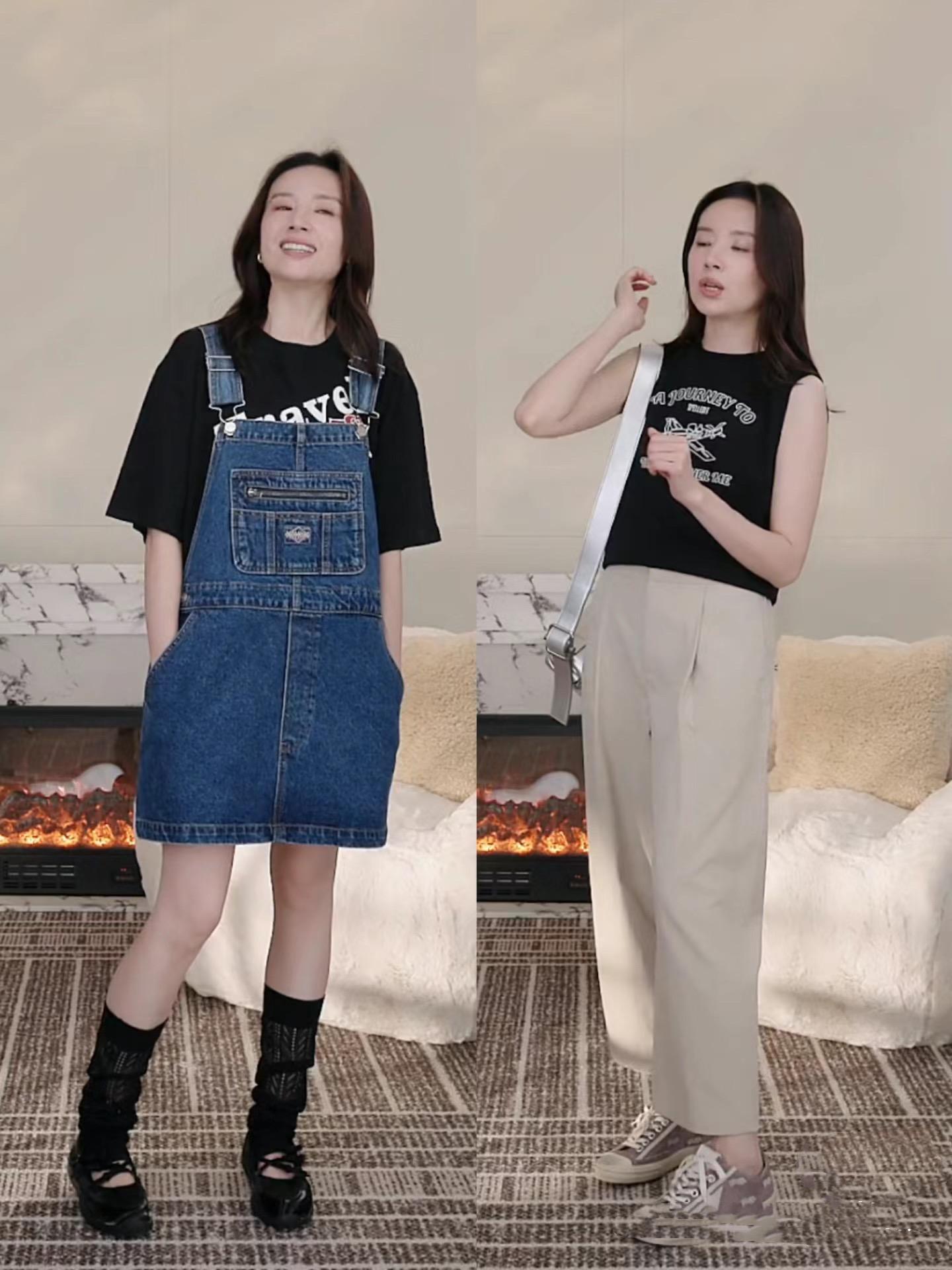 在服裝的搭配中,可以融入適當的減齡元素。比如字母卡通印花的T恤、或者自帶減齡效果的牛仔揹帶裙,都是比較減齡、顯年輕的單品。