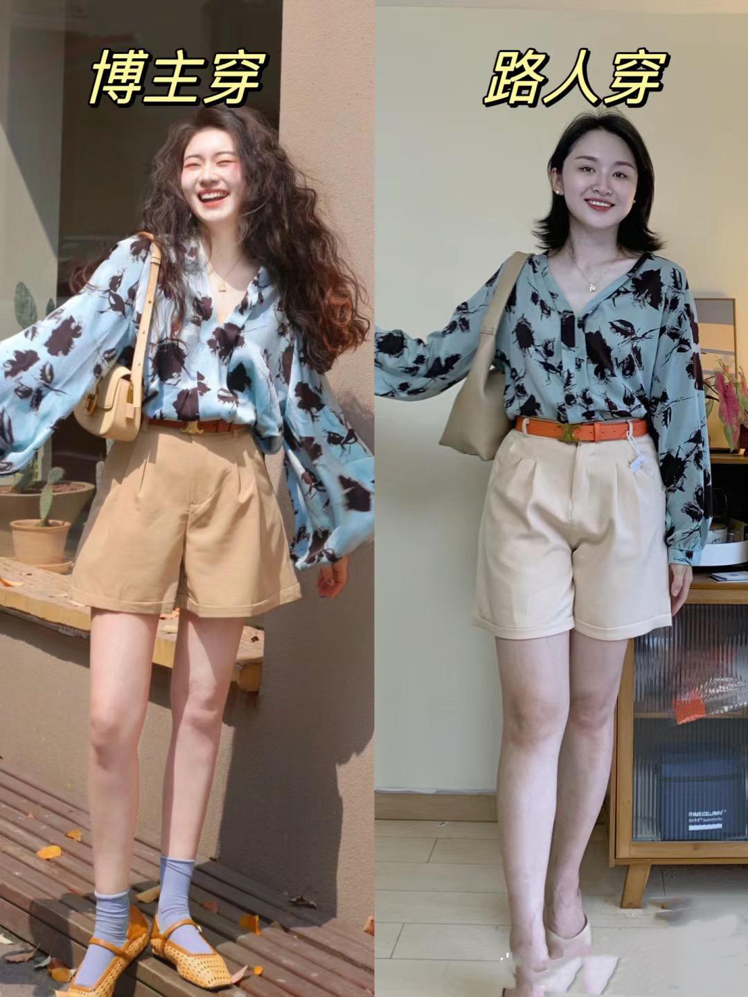 比如高腰的A字形短褲,搭配棕色腰帶修飾,就會有一種更時尚的美。印花襯衫+A字形的短褲,覆蓋了腰胯部的粗壯,顯得體型更爲輕盈。