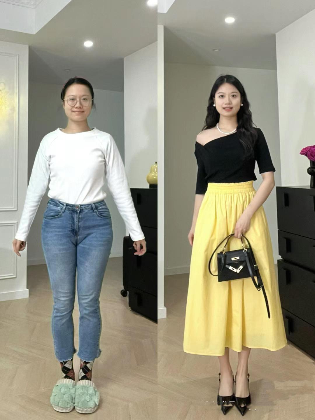 高腰的傘裙,選擇了比較明亮的顏色。黑色+黃色的配色,活力十足又很高級。日常的穿搭中,以露肩T恤配高腰傘裙,也是完美掩蓋了梨形身材腰粗、腿粗、胯寬的問題。