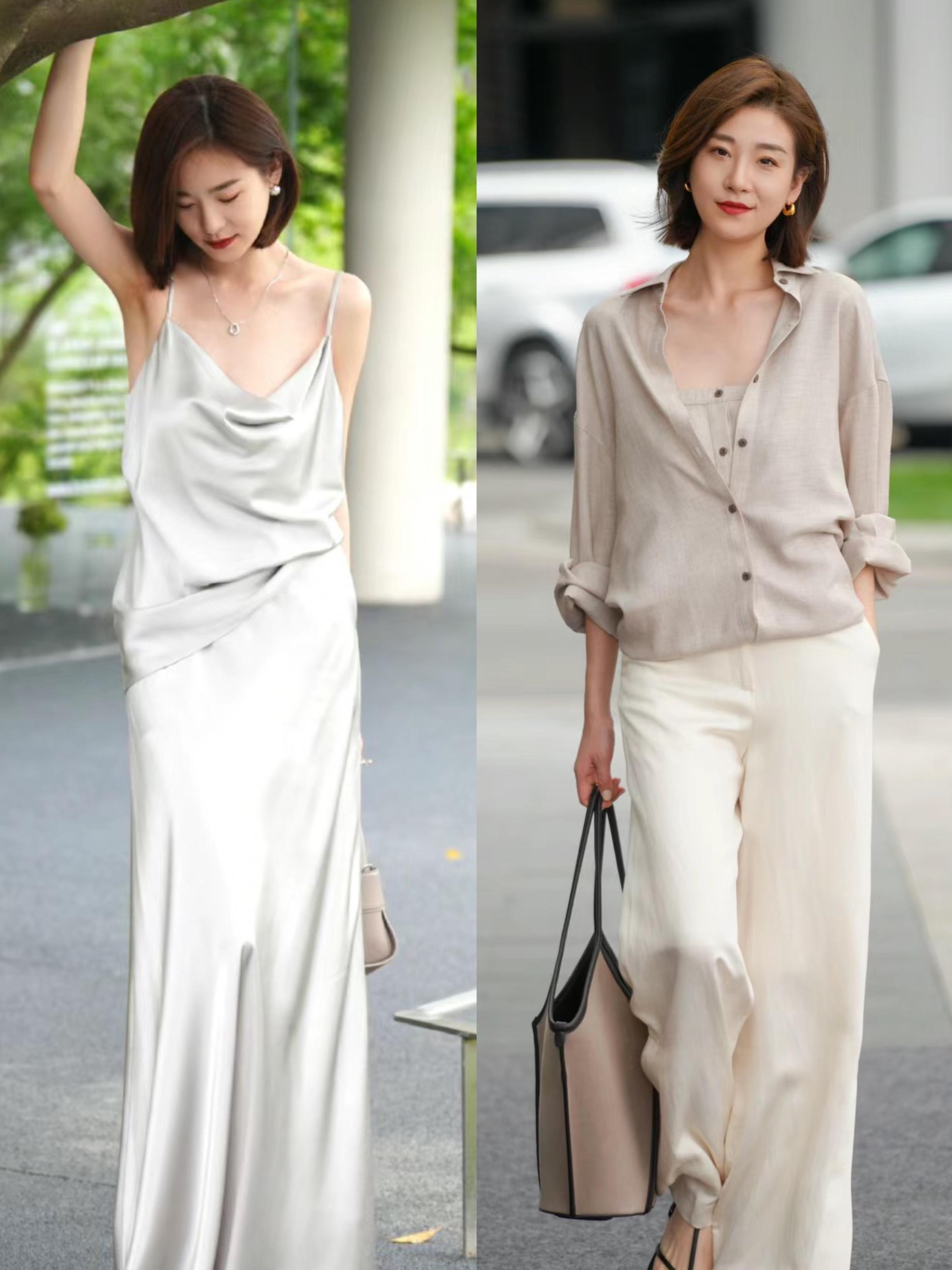 通勤族的高級感穿搭,必然少不了一件醋酸襯衫。細膩的面料、泛着輕微的光澤感,也更加洋氣顯瘦。