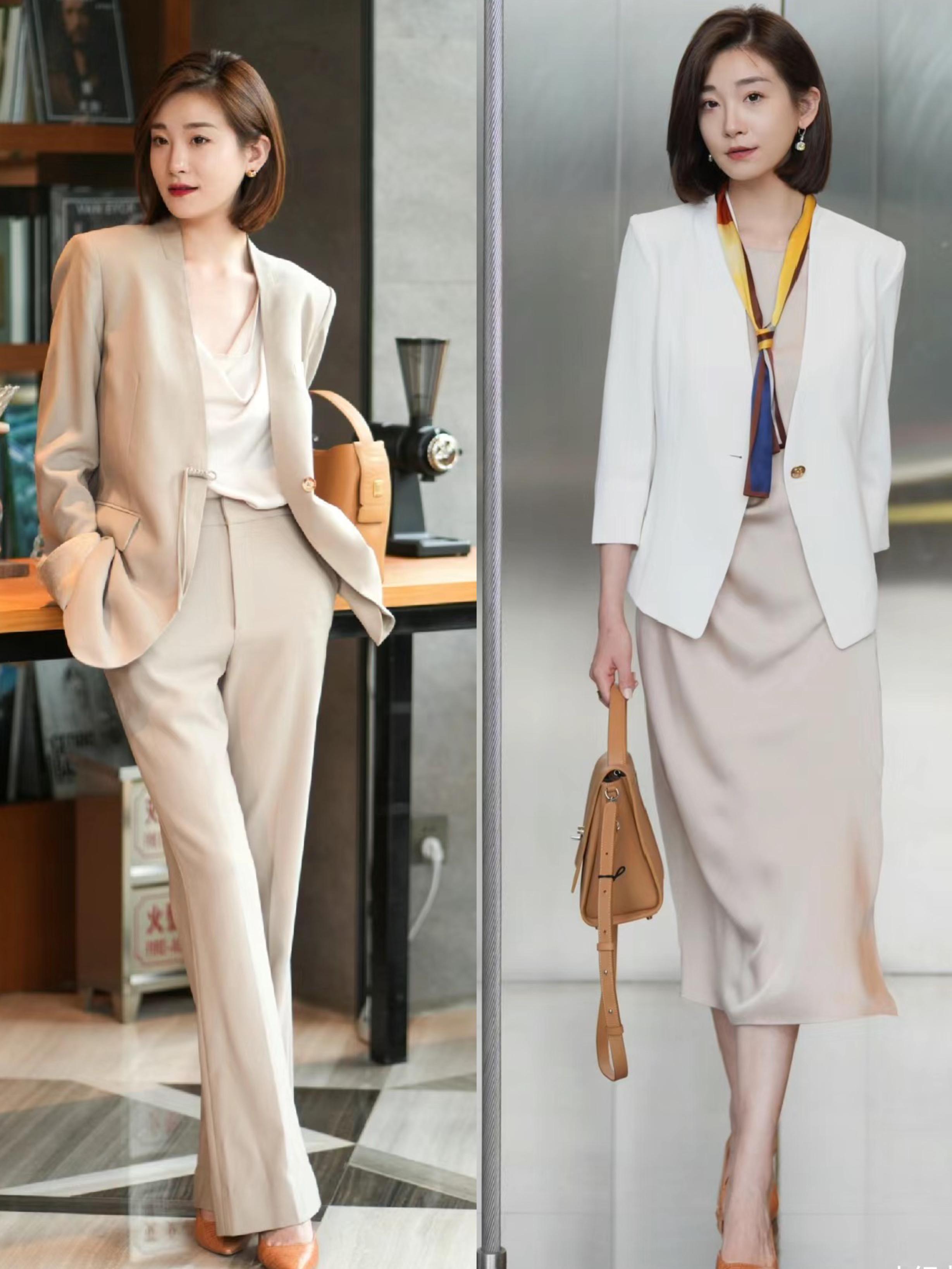 氣場滿滿的穿搭,也是讓人眼前一亮呀。淺卡其色的西服套裝/套裙,都是職場必備穿搭。