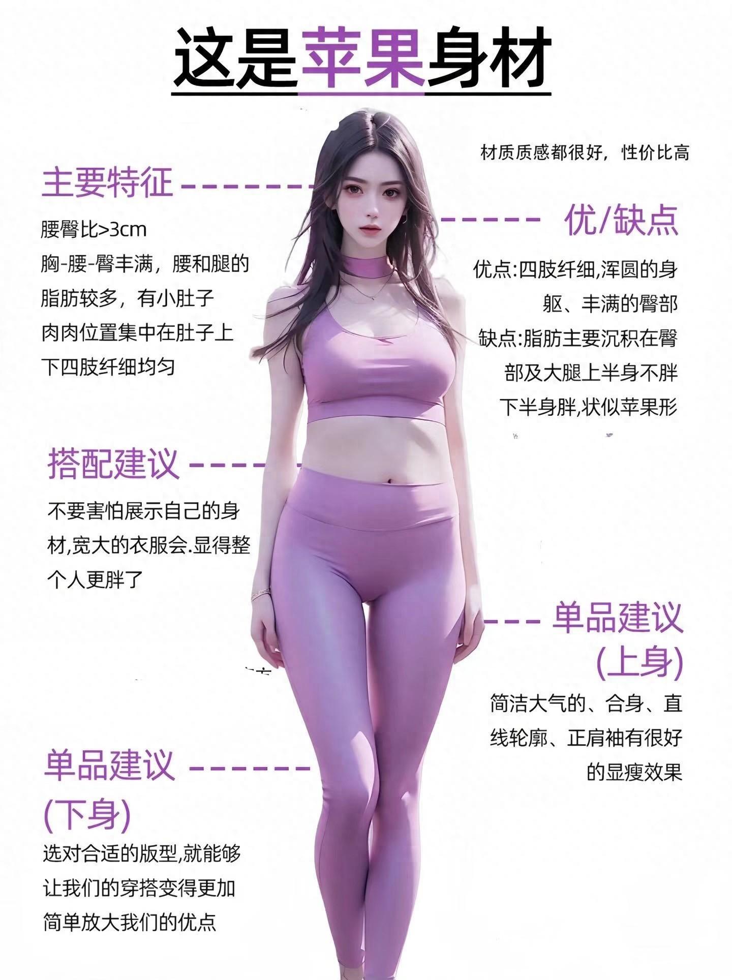 蘋果型身材,就是胸、腰、臀都比較豐滿,腰臀比>3cm。腿部、腰部、臀部脂肪比較多,四肢相對纖細勻稱。