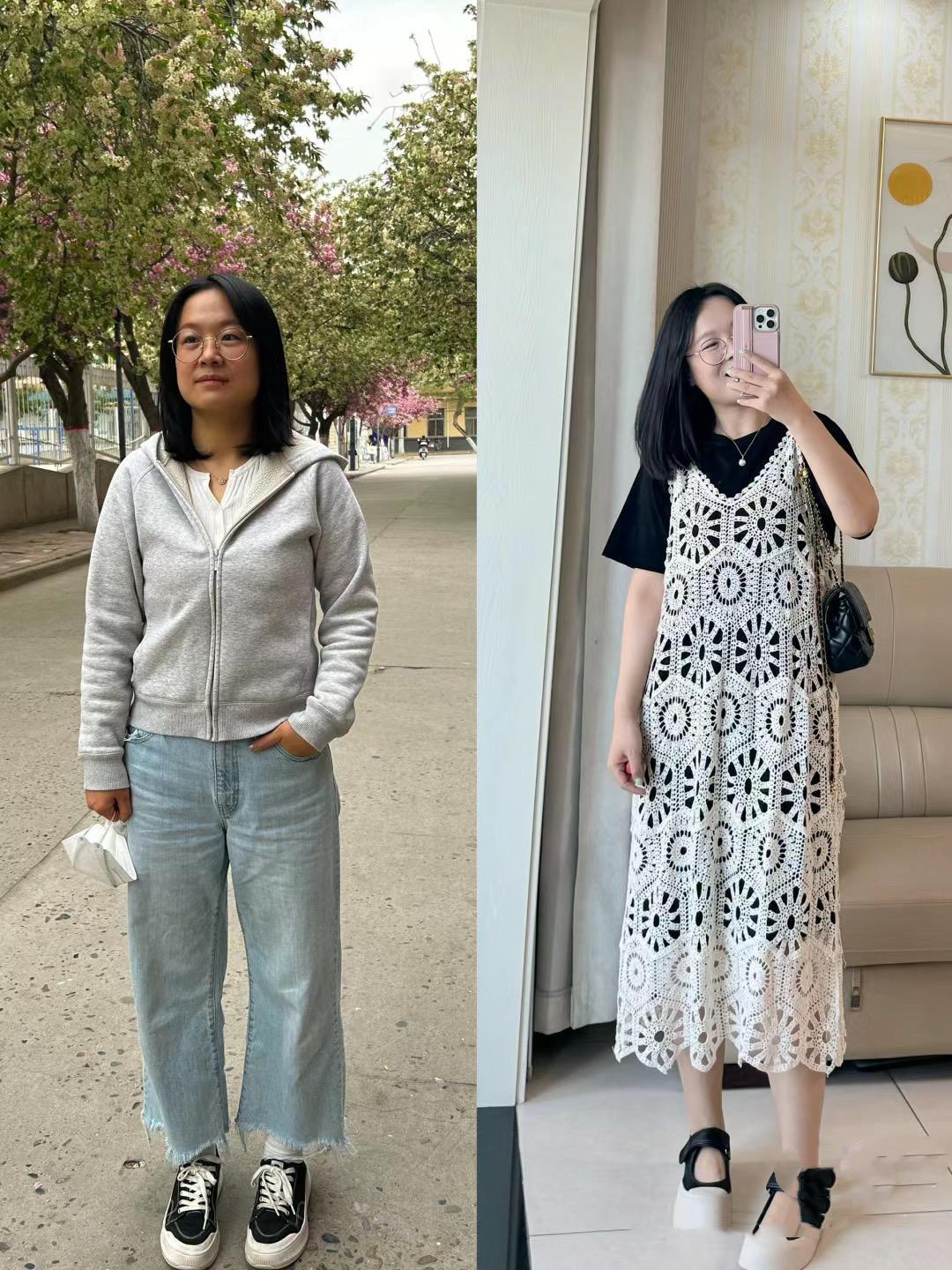 以黑色T恤裙作爲內搭,疊搭了鏤空感的吊帶裙,非常的時髦減齡。整體穿搭透着呼吸感、也非常的顯瘦。