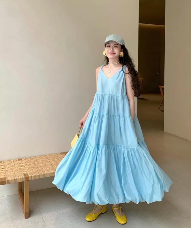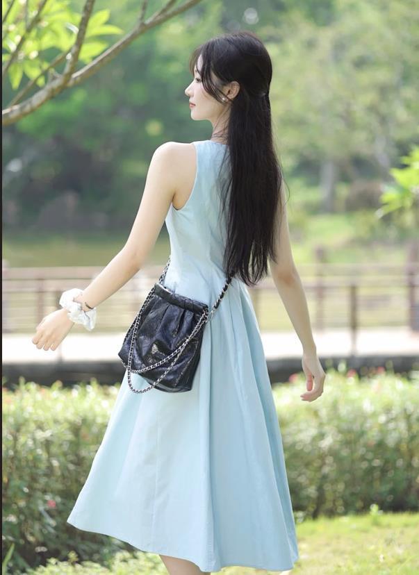 這個夏天,氧氣感穿搭實在是太火了,淡淡的藍色,完全不挑膚色了,很顯白,黃黑皮的膚色都是可以駕馭的。無袖款連衣裙,悶熱的夏日穿實在是太清爽涼快了,簡約又大方的款式,不管是約會逛街,還是度假穿都是妥妥的。