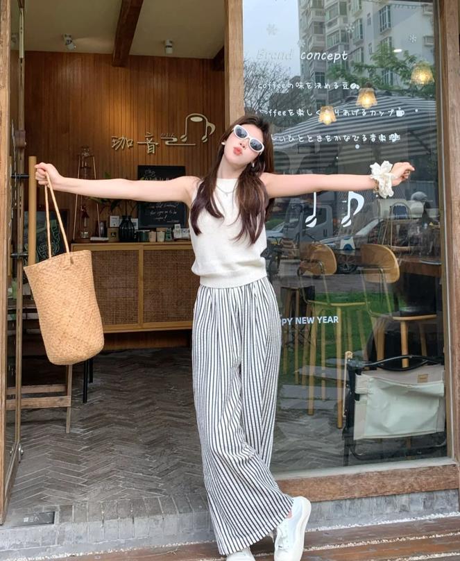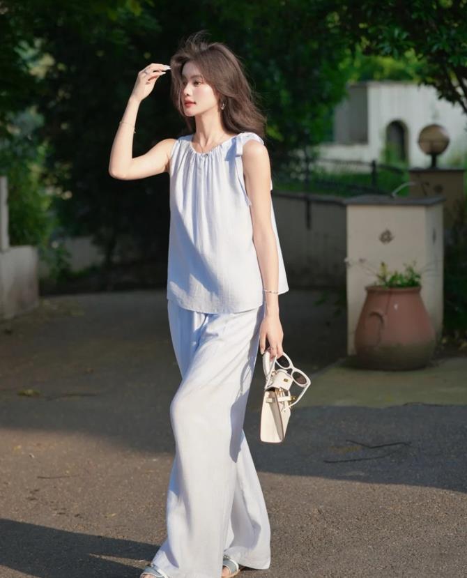 植物系氧氣感穿搭,對於不懂搭配的姐妹來說,就可以借鑑起來,無袖衫+闊腿褲,版型是偏寬鬆的類型,這樣的衣服穿起來可太舒適自在了,也很顯瘦。低飽和度的配色,太襯膚色了,舒適又吸睛。