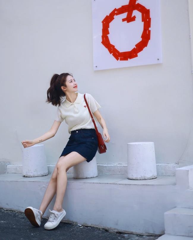 頗顯韓味的穿搭,乾淨又充滿氧氣感,白色polo衫+牛仔短裙,一整個穿搭看起來是那麼青春又充滿活力。利用紅色挎包進行點綴,真的是又甜又韓啊,白色運動鞋的點綴,又爲整個着裝增添了休閒氣息。
