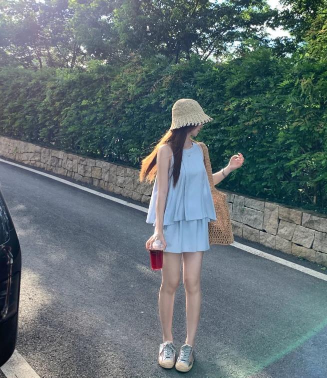 對於不知道要怎麼把氧氣感穿搭展現得更出衆的話,可以直接爲自己選擇套裝,掛脖式的背心+同款短褲,這麼一套有點露思風呢。清新的藍色,飽和度並不高,很襯膚色又顯白,寬鬆的版型,可以爲你帶來鬆弛感,舒適自在又好看。