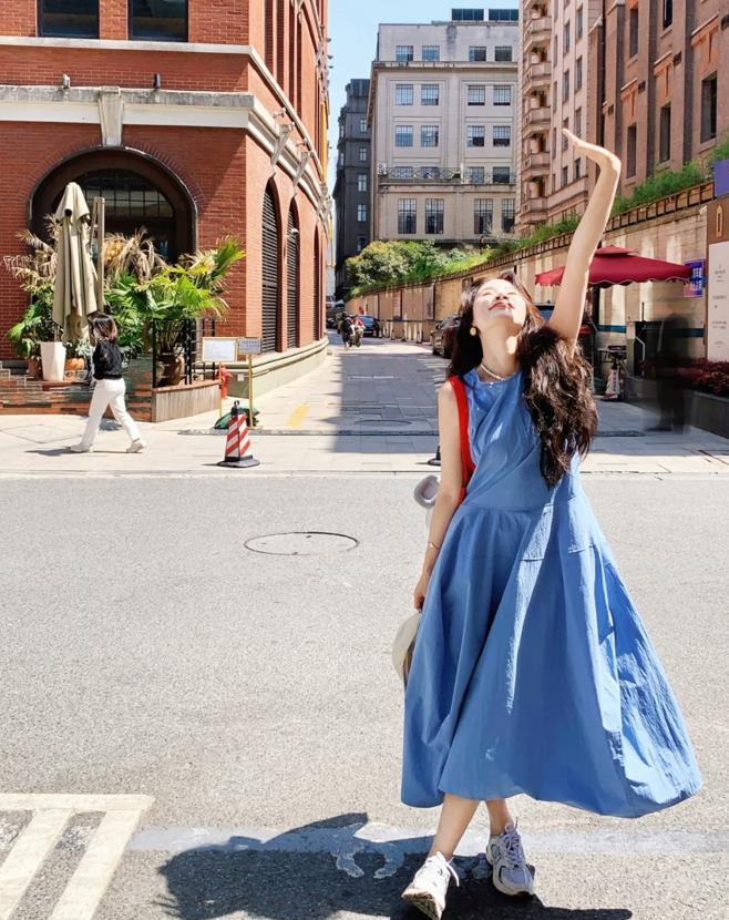 什麼是氧氣感的穿搭呢?其實就是指顏色清新的造型,瞧這麼一條低飽和度的藍色吊帶連衣裙,實在是太適合夏季穿了,不僅襯膚色,還可以讓你整個人看起來充滿活力,寬鬆的裙身,給足了身材包容性,顯瘦更藏肉。腳下踩着的黃色單鞋,和手裏拿着的包包進行了呼應。
