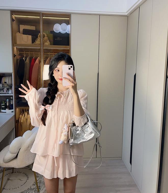 甜美氧氣感少女風穿搭,套裝款式,很省心,基本不需要考慮怎麼穿得問題,只需要簡單配一雙鞋子就行了,低飽和度的粉色,讓你整個人看起來都很減齡,a字版型遮肉又顯瘦,真的太甜了。
