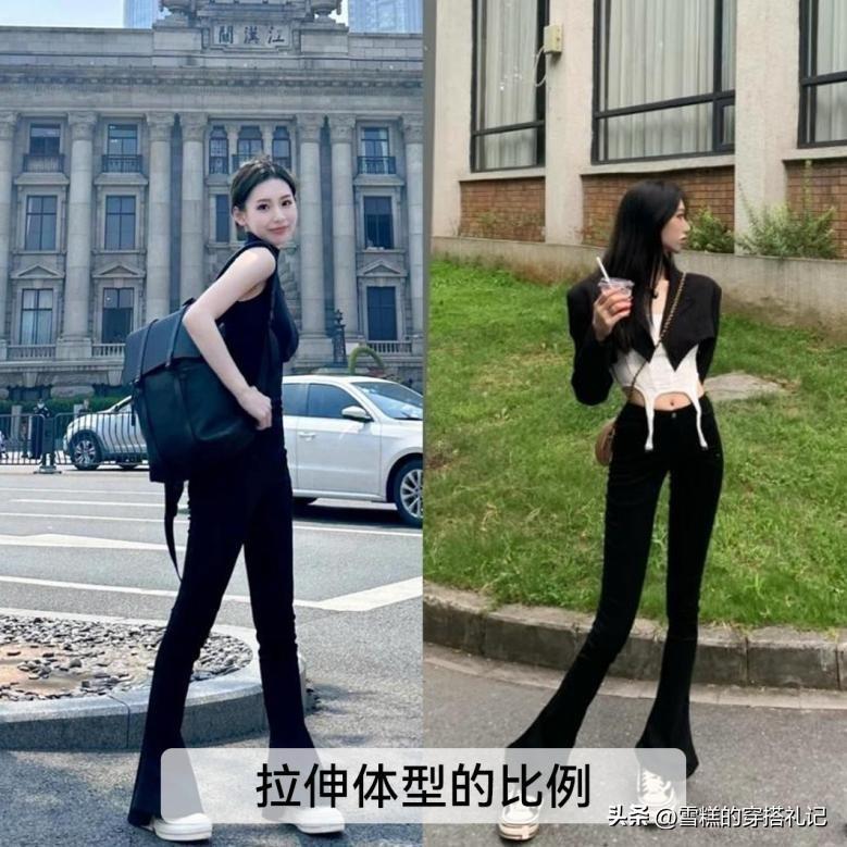馬蹄褲本身的長度千萬不要打折扣,不要選擇九分或者是七分的設計,最好看的一定是加長的版型,這個腳面甚至是微微拖地,這能夠爲你的縱向比例延伸貢獻一份力量,體型的比例不喫虧。