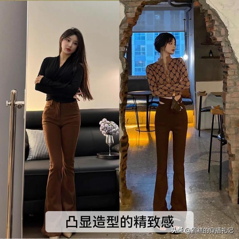 高腰款型設計的馬蹄褲又爲我們塑造了另一個穿搭的便捷性,我們很多時候並不需要強行去劃分出腰線的位置,只需要去匹配一件偏短款的上衣,因此來對比出身材上短下長的曲線效果,這也是很多小個子女生夢寐以求的穿衣特徵。