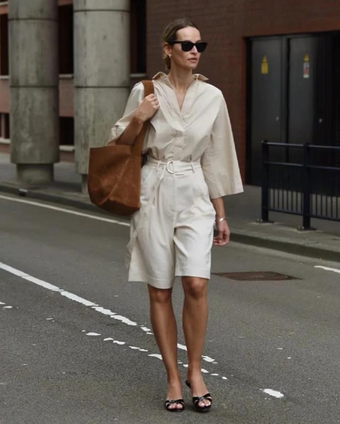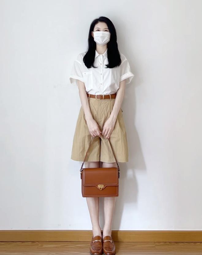 夏天,就是喜歡自然清爽的搭配,簡簡單單的就很好看,簡約又不失高級感,基礎款白襯衫+卡其色百慕大短褲,今年這種短褲也非常流行,很遮肉顯瘦。棕色的鞋子、包包以及腰帶,都對整個着裝進行了點綴,增添了幾分復古的味道。