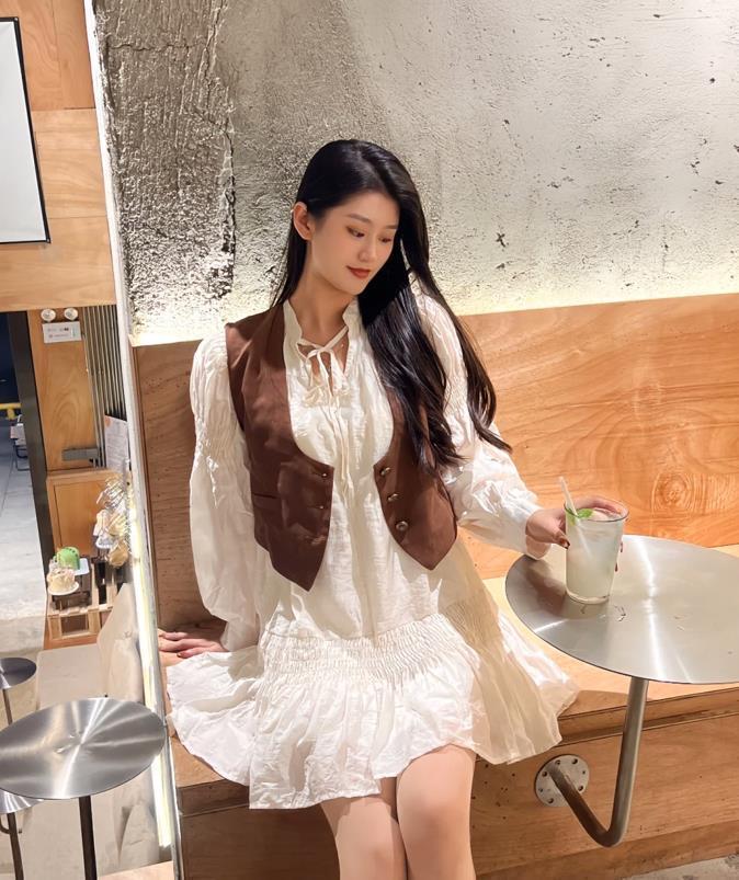 小白裙+棕色馬甲,這就是一套很亮眼復古的穿搭,腳下可以再選擇一雙與馬甲顏色相同的配色,這樣就打造出復古範了。有種美拉德風的既視感,出門度假遊玩這麼穿,真的很有回頭率,拍照也很上鏡哦。