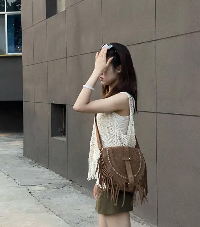 棕色流蘇包包,自帶復古氣息,這一身美式辣妹風穿搭,喜歡的姐妹就學起來吧,白色無袖背心和軍綠色短褲相配,又多了幾分帥氣感。腳下踩着的大黃靴,瞬間讓你多了幾分波西米亞風情。