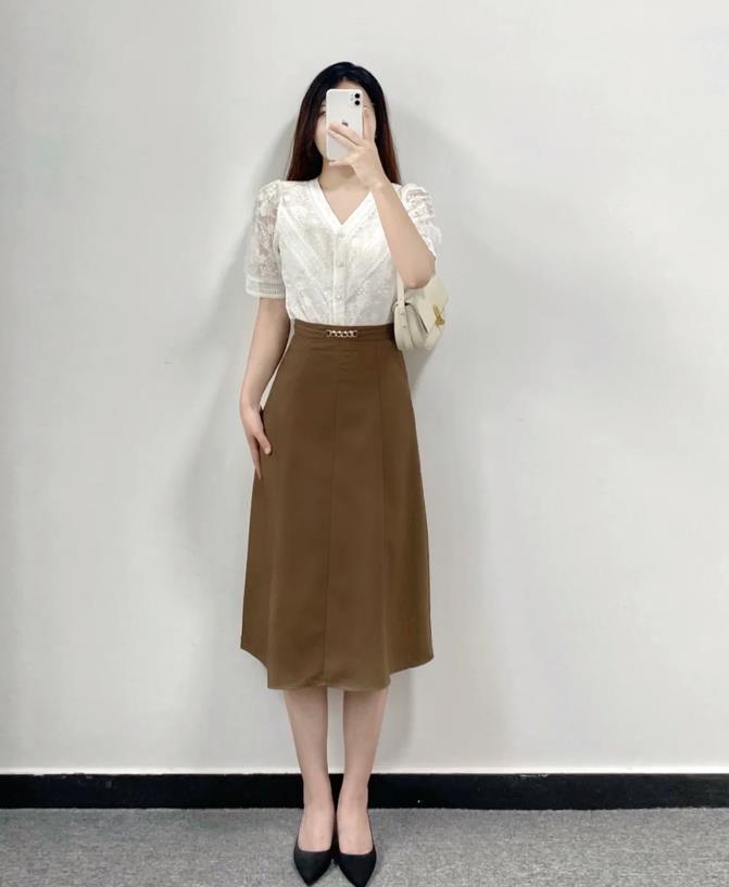 很適合職場通勤穿的一套,蕾絲白色襯衫,細節感很強,v領的設計,可以巧妙拉長脖子線條,在視覺上顯瘦。搭配一條棕色半身長裙,加上一雙尖頭單鞋,真的太顯氣質和優雅了。