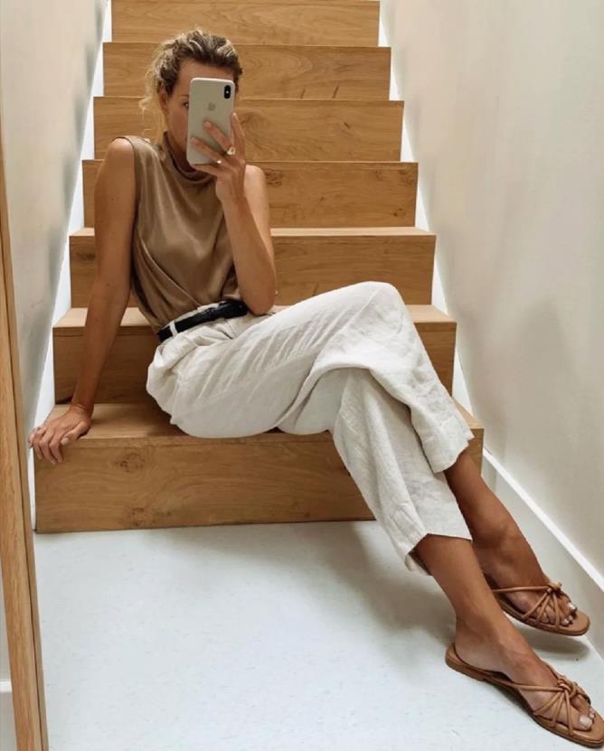 當白色遇上棕色,高級感不言而喻了,很適合夏季穿的無袖背心,加上棕色配色點綴後,更多了幾分高級和質感。與白色的褲子相配,又多了幾分清爽乾淨的氣息。腳下踩着一雙棕色涼鞋,巧妙與上衣進行了呼應。