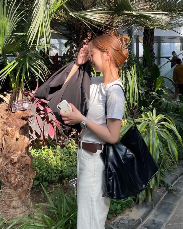 白色基礎t恤+白色牛仔九分褲,上下同色的組合,最是省心了,也能輕鬆打造出高級感,利用咖色腰帶進行點綴,既修飾了整個身材比例,又強調了腰部線條。