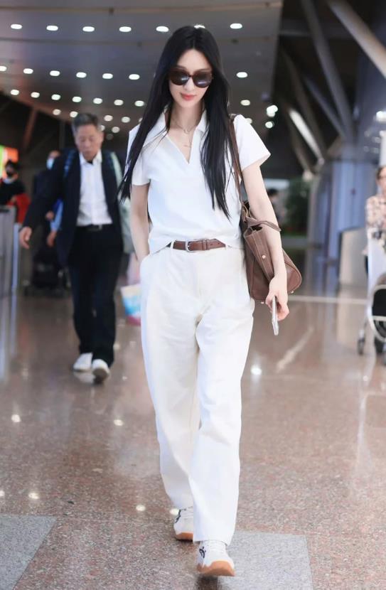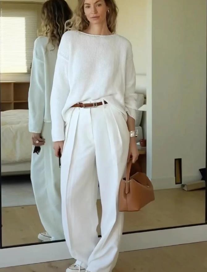 如果你覺得自己的膚色駕馭不了棕色,那麼就選擇大面積的白色吧,這個色調可是很百搭的,也很不挑膚色。白色上衣+白色闊腿長褲,一身都是鬆弛感的打扮,實在是太顯隨性和自在了,腰間配的棕色腰帶,和手裏的包包進行了呼應,很高級又耐看。
