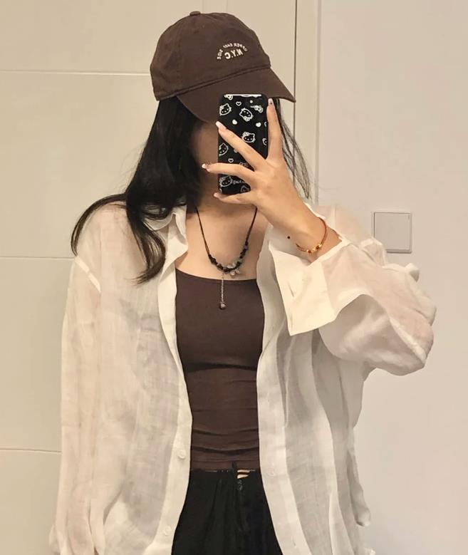 棕色的背心和帽子,再套上一件白色防曬衫,很輕薄透氣和舒適,不管是在戶外穿,還是在空調房都是可以的,下裝搭配一條黑色的褲子,這麼一套穿搭,簡單舒適又自在。
