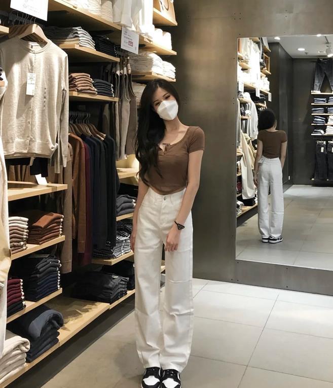 大夏天的又怎能沒有一件短袖t恤呢?今年很流行這種正肩短袖,穿起來似乎可以很好修飾你的身材比例。搭配一條白色牛仔闊腿褲,再加上一雙運動鞋,上緊下松的組合,很好優化了整個身材比例,顯瘦又顯腿長。