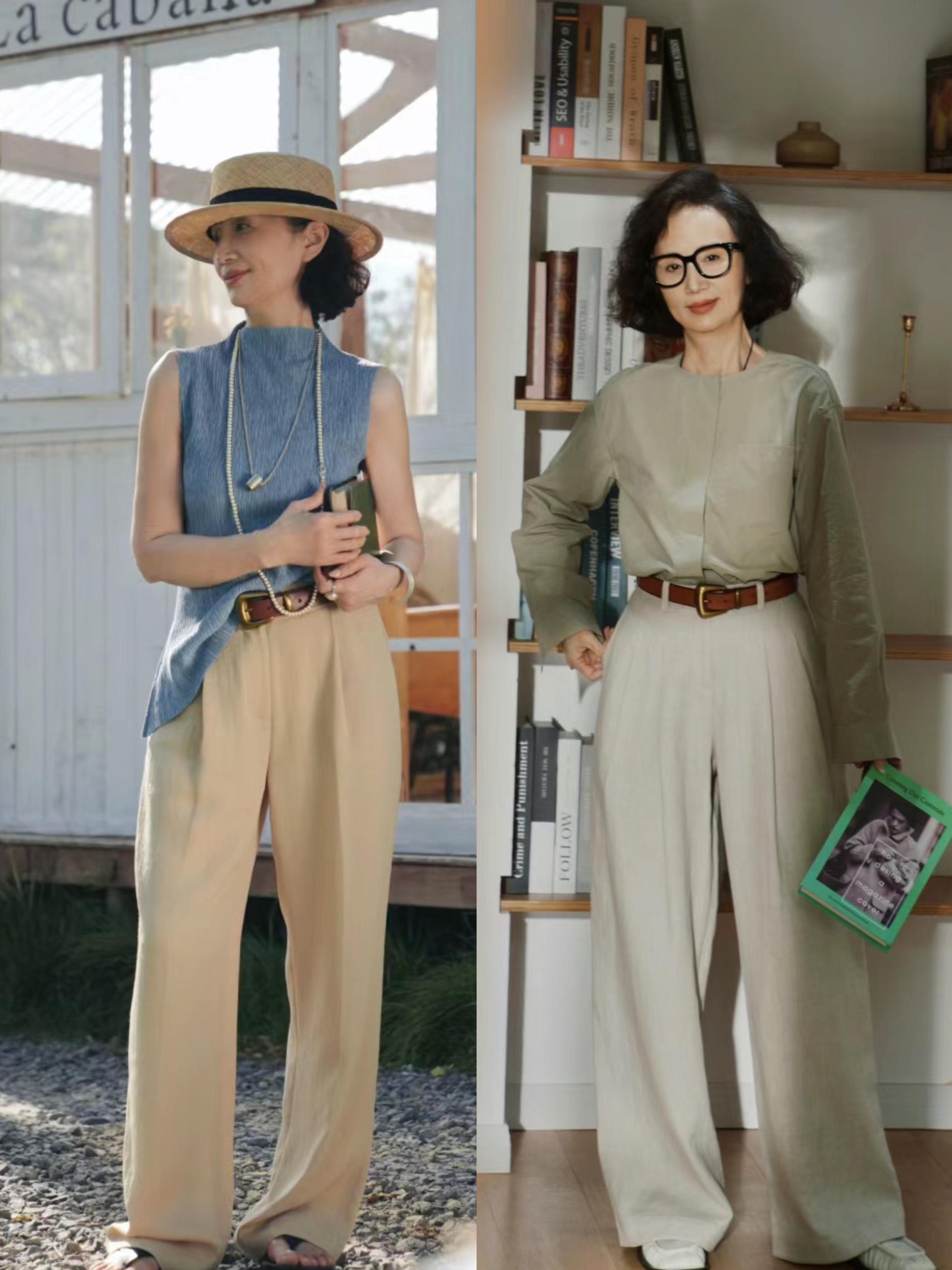 寬鬆的長褲,是舒適的、也是鬆弛的,可以表現出成熟女性的大氣美。
