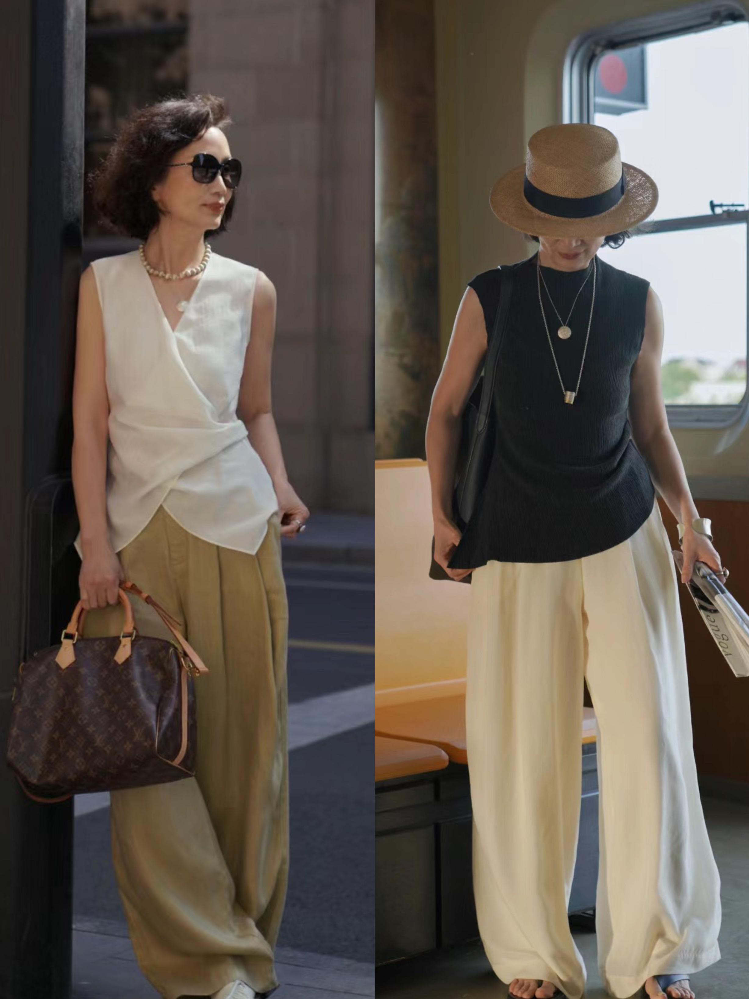 棉麻、苧麻、或者冰絲的闊腿褲,都更加輕薄透氣一些。配合紋理感的面料,也自帶鬆弛與慵懶。