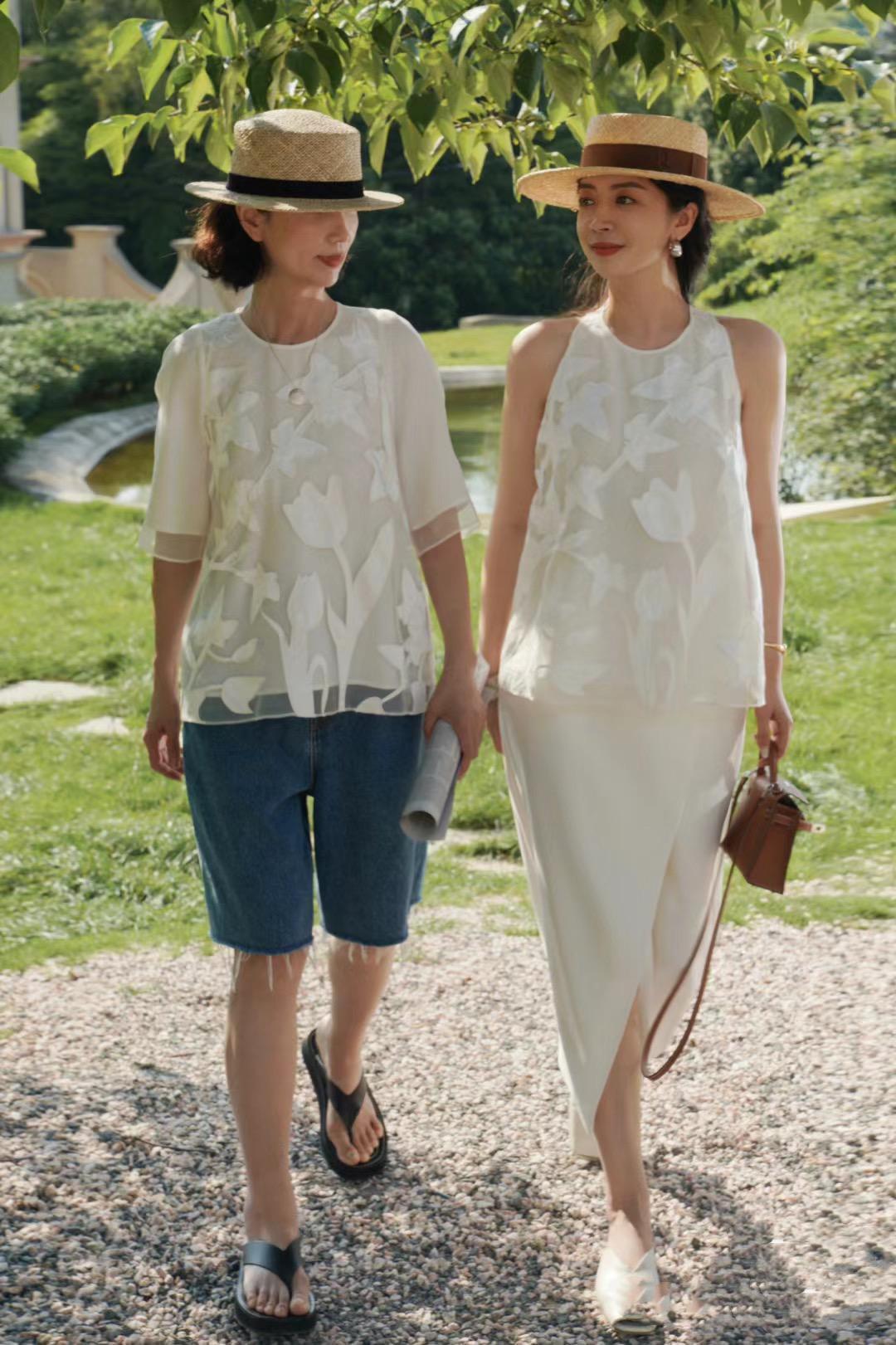 清爽中帶一點少年氣的穿搭,三木媽媽完美hold住了。這種面料輕薄的白襯衫,小飛袖的款式真的很涼爽。
