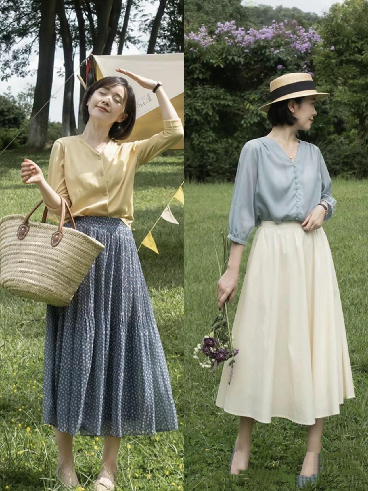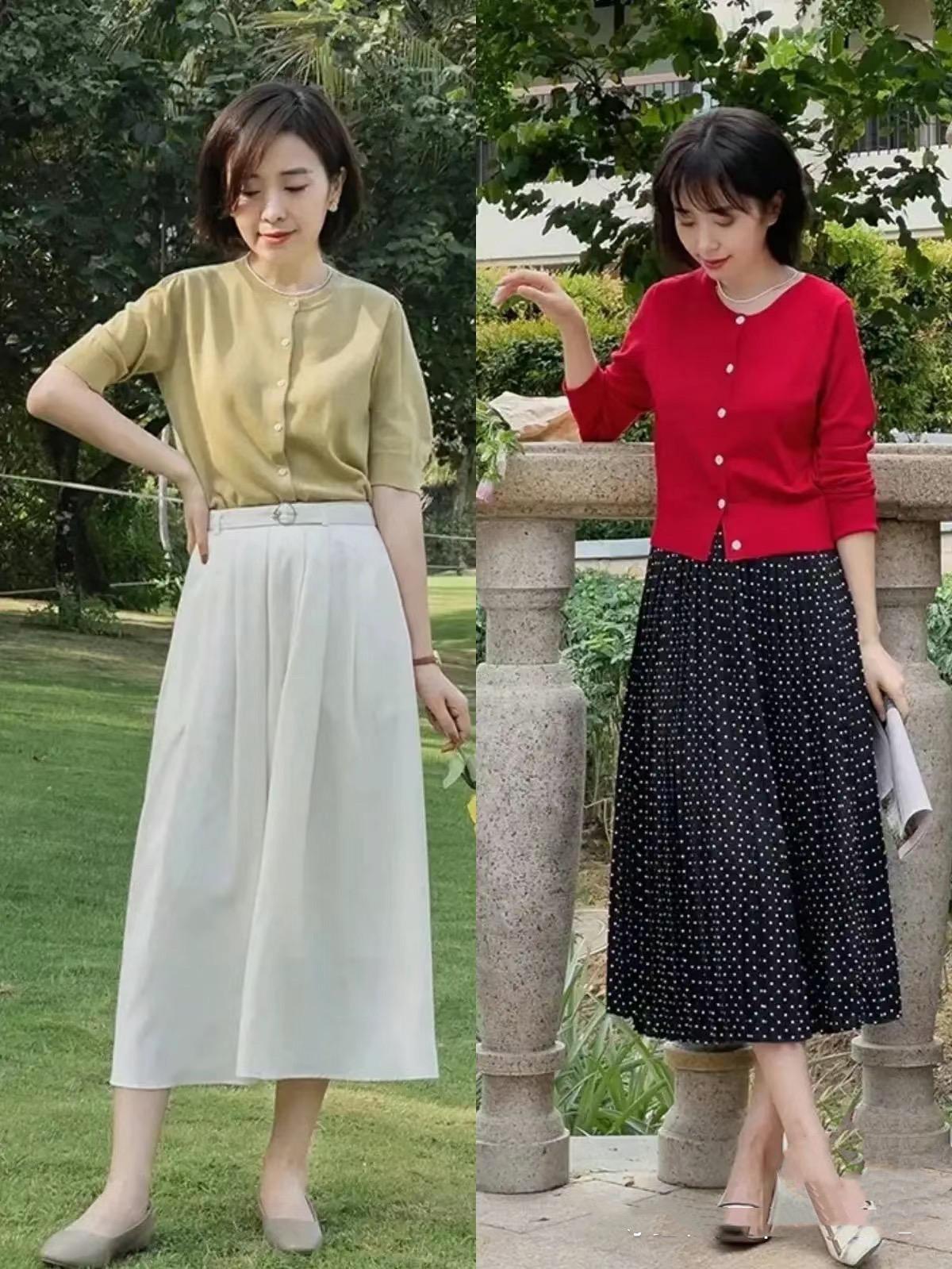 奶奶衫可以選擇收腰的款式,衣身更加寬鬆一點,就擁有了更強的舒適性。寬鬆的奶奶衫,配赫本風半身裙,對於胸部豐滿、上半身厚重的女性也很友好。
