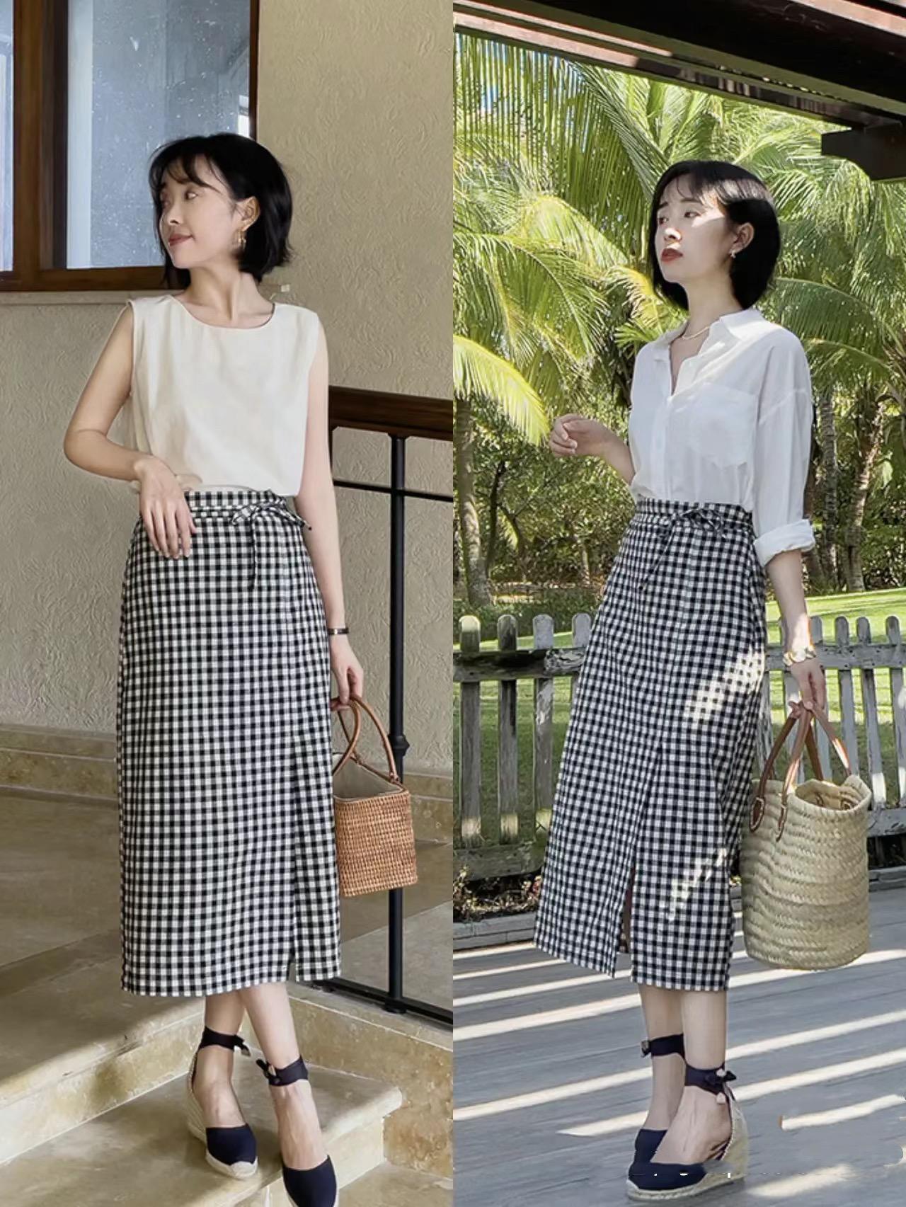 白襯衫的顏色,就是取自於黑白千鳥格半身裙。這種取色法的搭配,有一種簡約且高級的美。白襯衫清爽簡約、挽起衣袖也更加利落時髦。