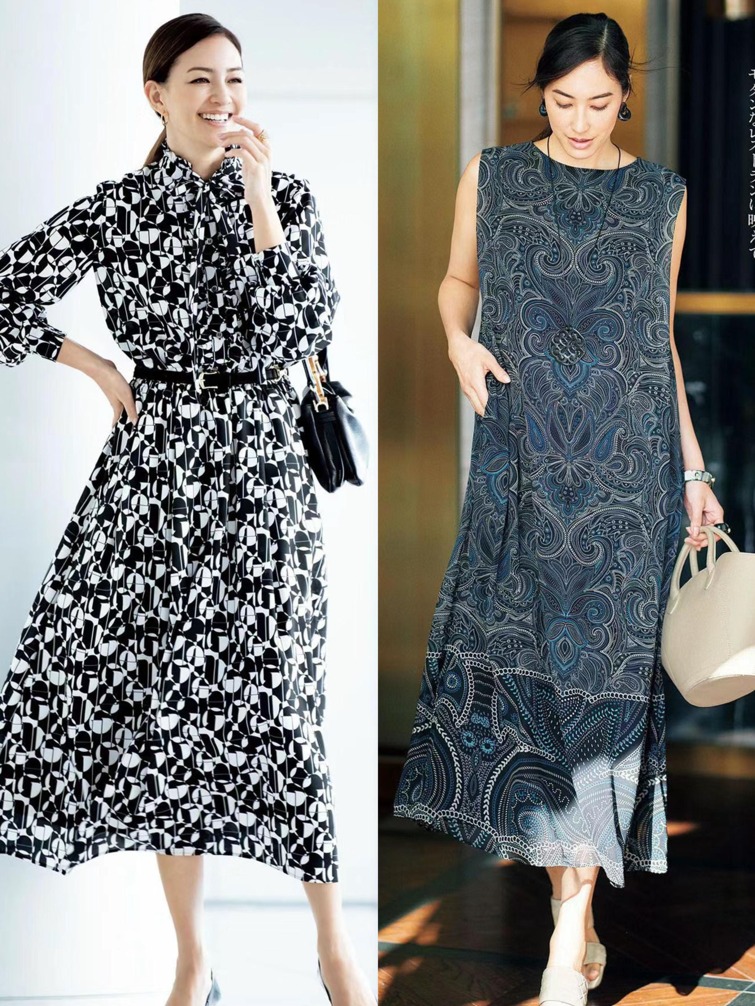 五六十歲的女人,更喜歡深色系的連衣裙。像這種黑色系的印花連衣裙,很容易加重年齡感,所以應該更多的在配飾上下功夫。