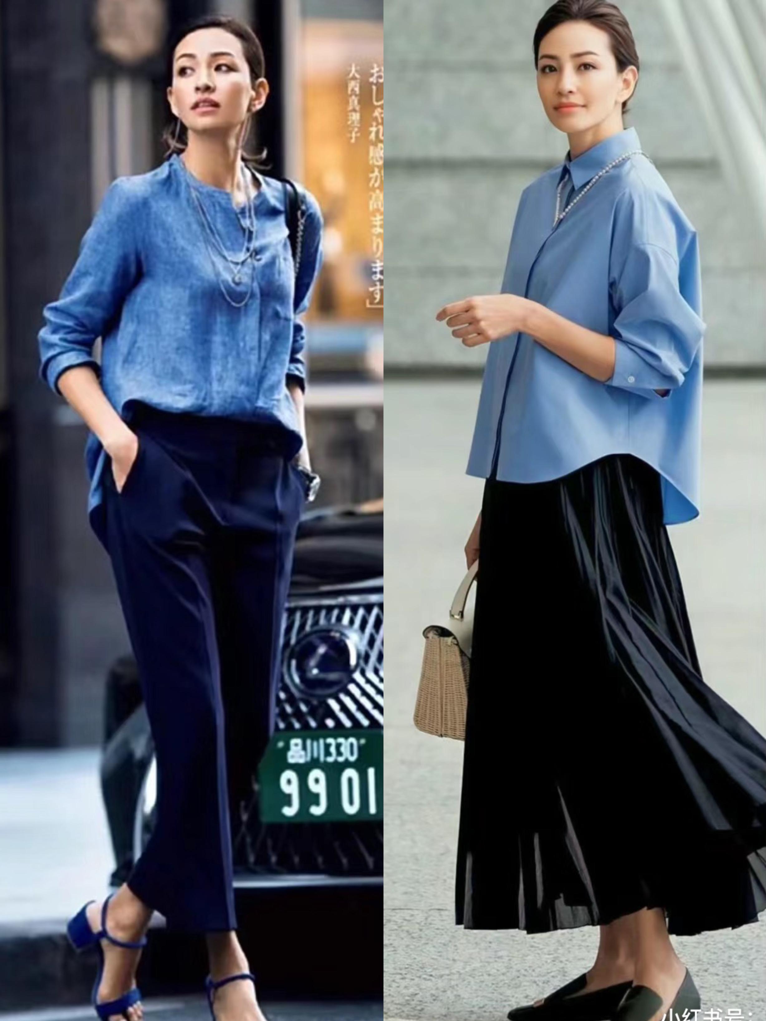 寬鬆一點的襯衫,選擇剛剛及腰長度的短款版型。短款的藍色襯衫+高腰的傘裙,穿起來優雅又顯瘦。藍黑配色、夏天裏穿起來也清爽高級!