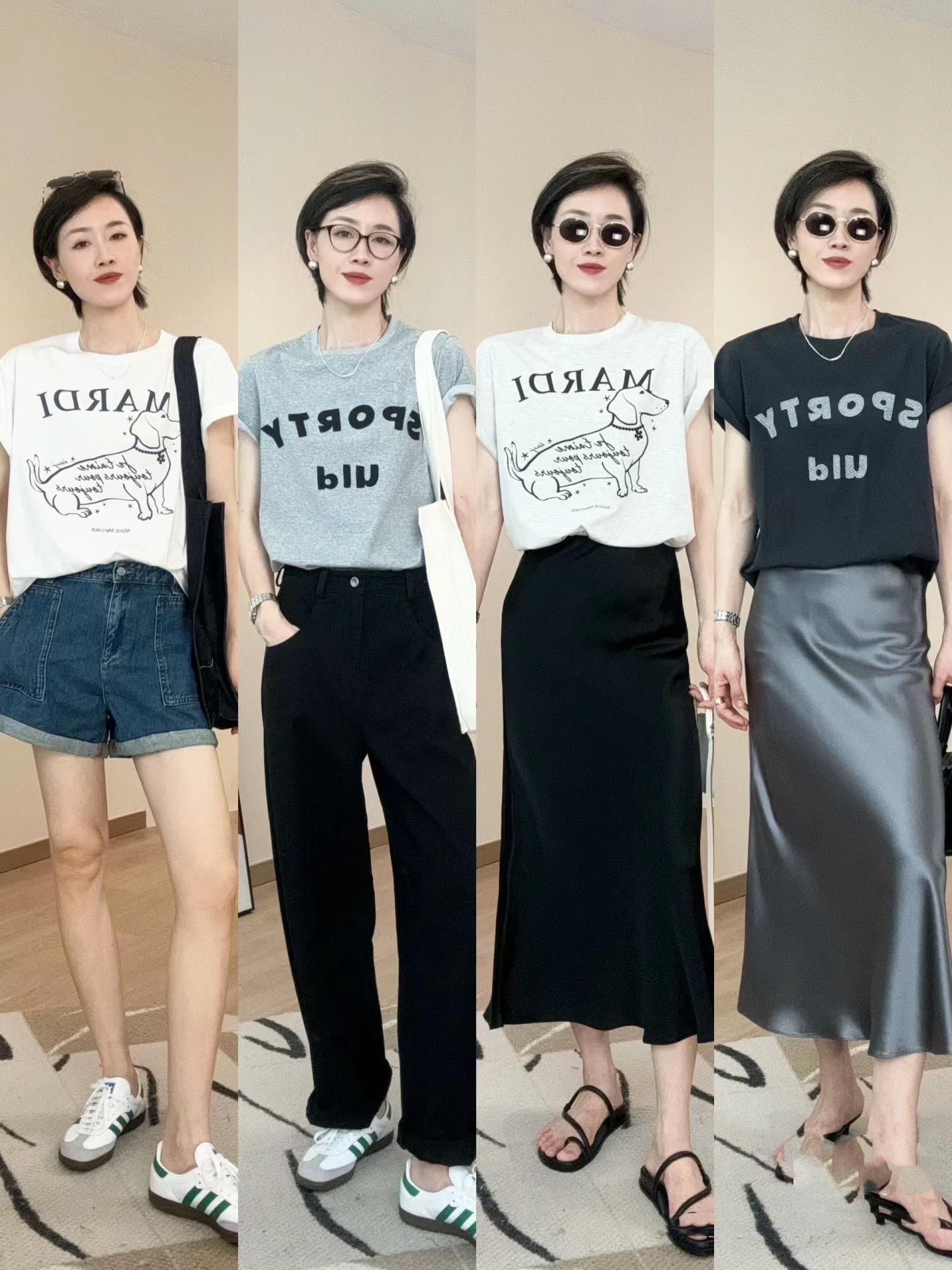中年女性想要更加減齡一些,完全可以嘗試這種字母印花T恤+極簡風下裝的搭配組合。尤其是收腰的魚尾半身裙,更凸顯出女性的魅力。