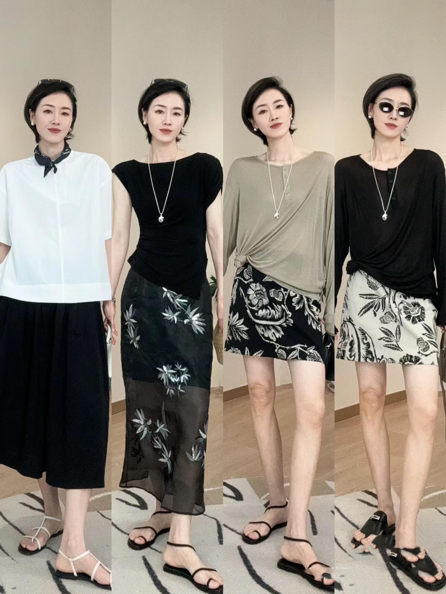 以素雅的印花半身裙,來搭配純色系的T恤,不僅顯瘦還提氣質。尤其是純色T恤,配上個性的收腰、捏褶、紐結元素,更加時髦洋氣了。