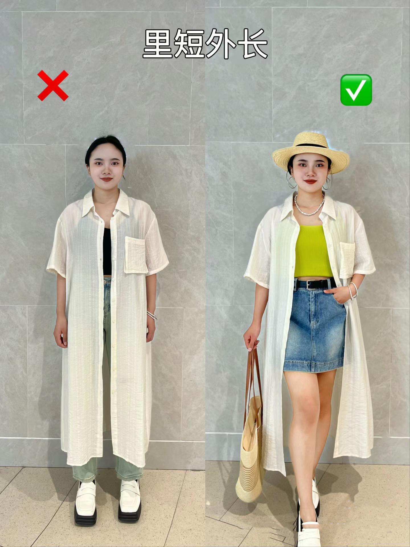 搭配寬鬆的防曬罩衫,過膝的長度形成裏短外長的組合。寬鬆的白色防曬罩衫、輕盈舒適、遮陽效果也不錯,夏天裏穿起來很有氛圍感。