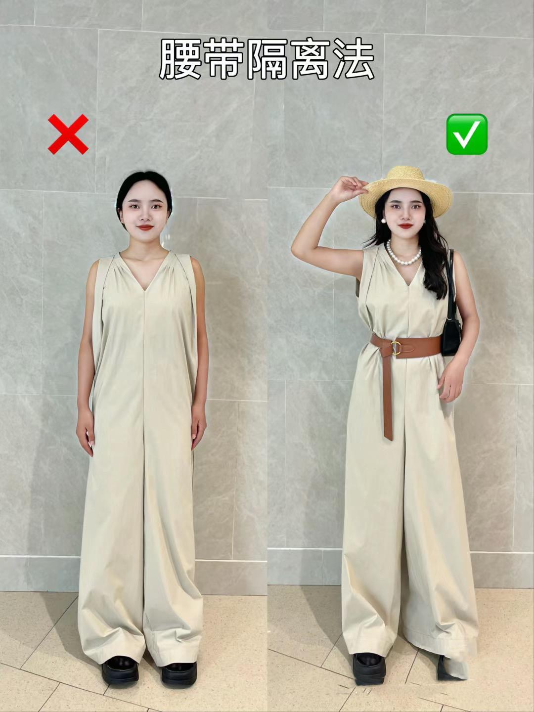 最簡單直觀的就是腰帶隔離法了,就像寬鬆的連體褲穿搭,沒有腰帶的前提下顯出水桶腰。配上腰帶修飾,則表現出更優越的比例感,更洋氣顯貴。