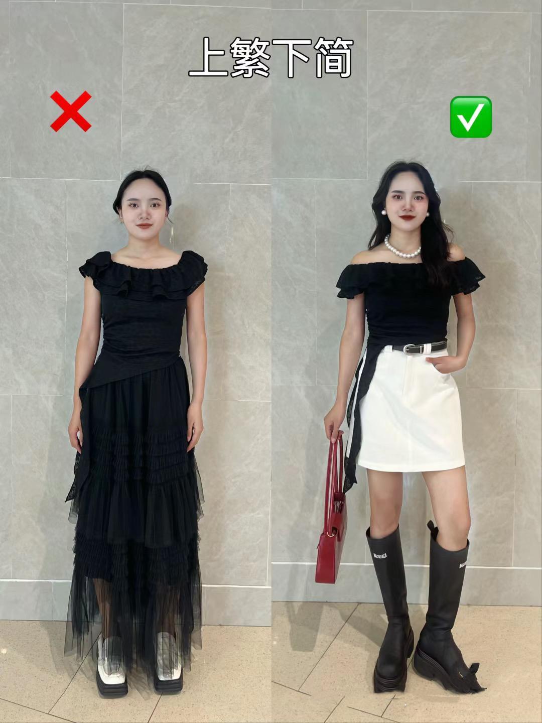 我們可以嘗試上繁下簡的搭配,比如一字肩的上衣、搭配極簡風的A字形半身裙,穿起來就非常的洋氣顯瘦,收腰遮胯的穿搭、更加清新減齡。