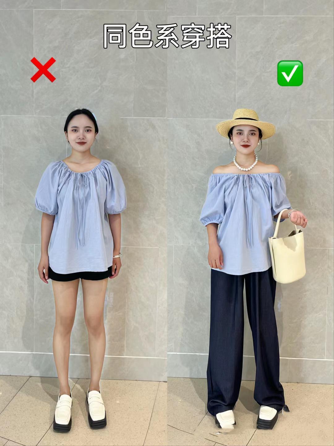就像淺藍色一字肩上衣,配上深藍色的直筒牛仔褲,同色系不同色調的搭配、格外的高級提氣質。視覺上形成縱向比例的延伸、不僅大方顯高、還自帶了高級範!