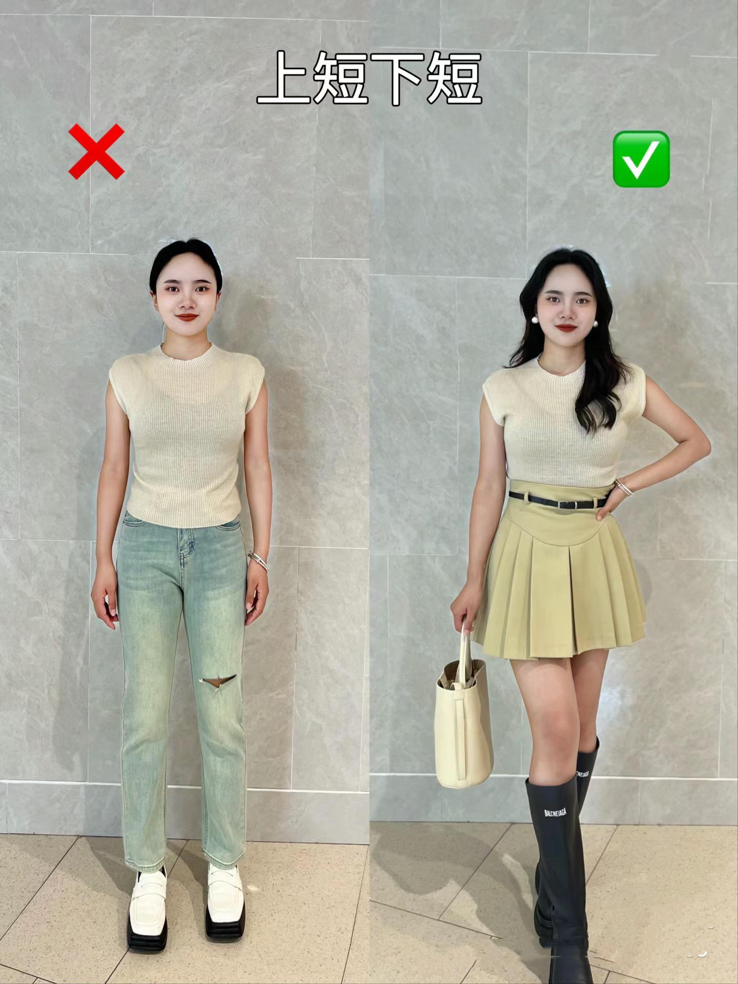 爲了拉伸腿長,很多人都喜歡上短下長的穿搭。其實上短下長和上短下短都有自己的優勢,上短下短穿起來更輕盈,也更減齡一些。