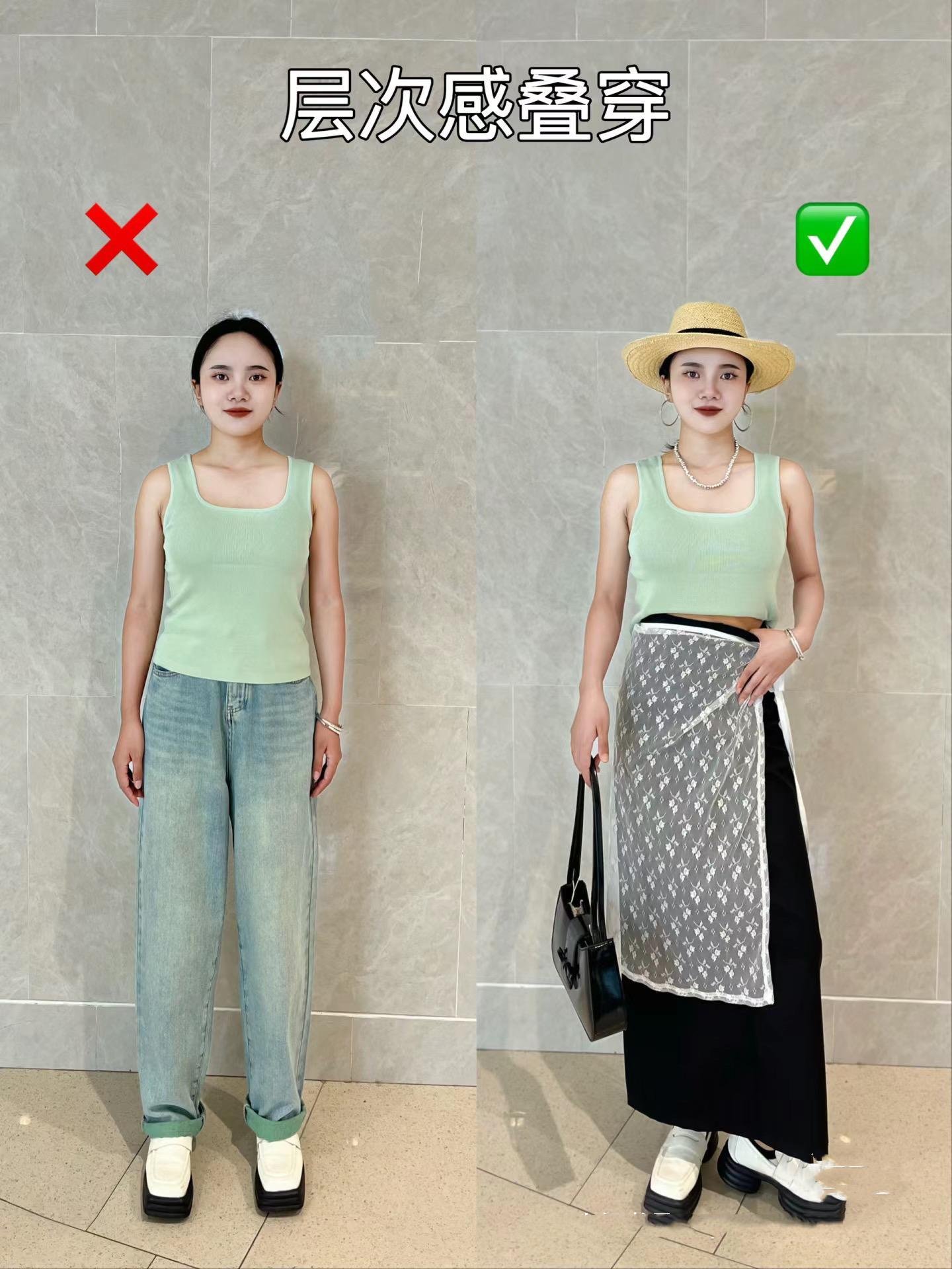 夏天裏太簡約的穿搭,總是讓人覺得乏味,這時候層次感疊穿就會讓人眼前一亮。尤其是黑色半身裙+蕾絲屁簾的搭配,嫵媚又顯瘦。