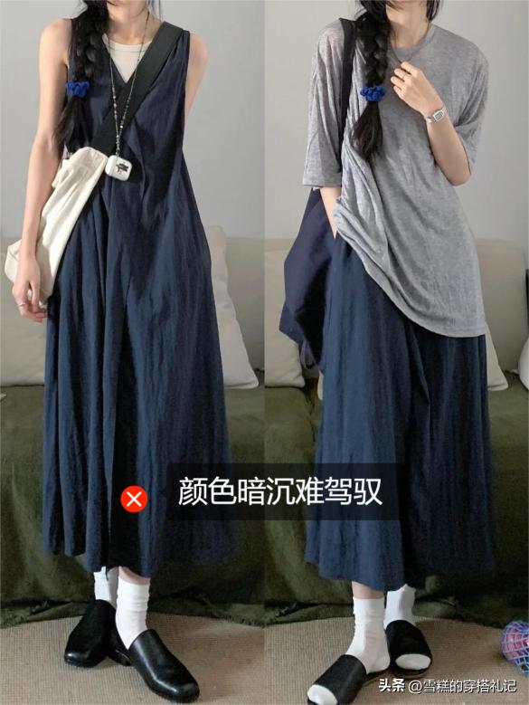 雪紡裙其實並不容易踩雷,但沾上了藏青色這種老氣而又老成的色彩,就很容易暴露出你的膚色短板。其實亞洲女性的膚色偏暖,穿上這種很濃重的冷色調,就會暴露你膚色當中的暗色氣質,一不小心就顯老氣了。
